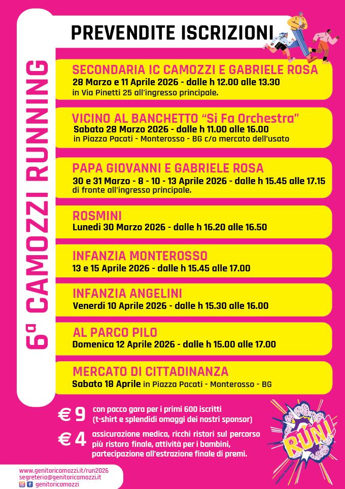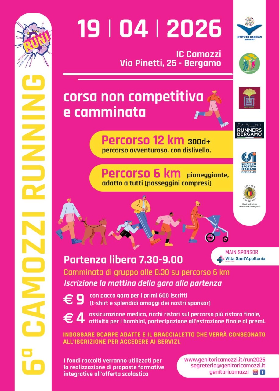Non sono mai domi gli organizzatori della Camozzi Running, camminata/corsa non competitiva dell’omonimo Istituto Comprensivo cittadino, che riunisce due scuole dell’infanzia (Angelini e Monterosso), tre primarie (Rosa, Rosmini e Papa Giovanni) e una secondaria di primo grado (Camozzi, appunto), tra Valtesse, Monterosso e Conca Fiorita. L’edizione di quest’anno (è la sesta), domenica 19 aprile, alza ulteriormente lo sforzo collettivo di coordinamento, organizzazione e raccolta fondi.