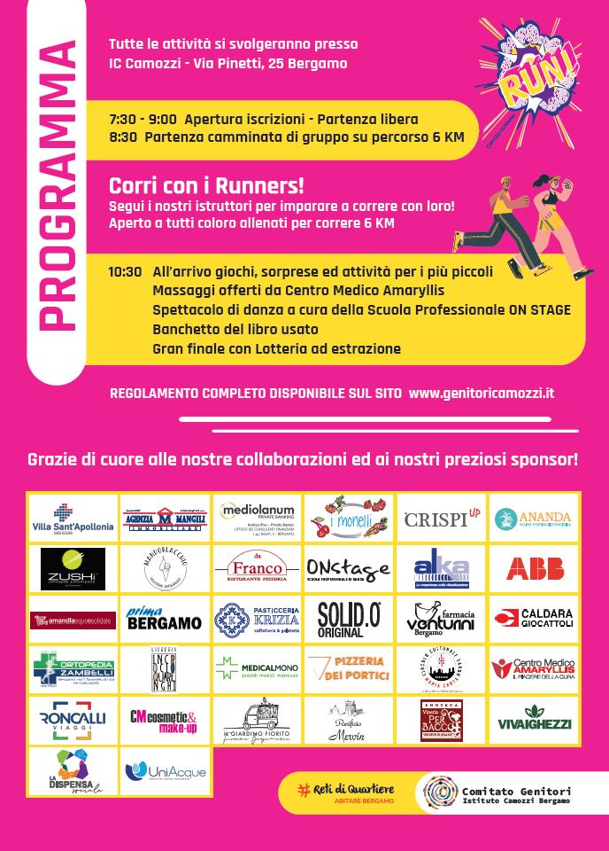 Il ritrovo per la Camozzi Running è fissato di fronte alla sede dell’istituto comprensivo, in via Pinetti 25, Bergamo. Partenza libera dalle 7.30 alle 9, camminata di gruppo alle 8.30 sul percorso di 6 chilometri (forse c’è anche la banda). Riconfermata anche l’iniziativa “Corri con i Runners”: si possono seguire gli istruttori dei Runners Bergamo per imparare a correre con loro. Aperto a tutti coloro abbiano forma fisica adeguata per correre 6 km. All’arrivo, dalle 10.30: giochi, sorprese e attività per i più piccoli, ristoro finale con panini, pizza, dolci, gelato (offerto da Mandorlacchio), prodotti tipici del Circolo Culturale Sardo Maria Carta, acqua, succhi, the e birra alla spina (per maggiorenni, chiaro); massaggi offerti da Centro Medico Amaryllis; spettacolo di danza Hip-Hop a cura della scuola professionale On Stage; banchetto del libro usato; gran finale con lotteria a estrazione.