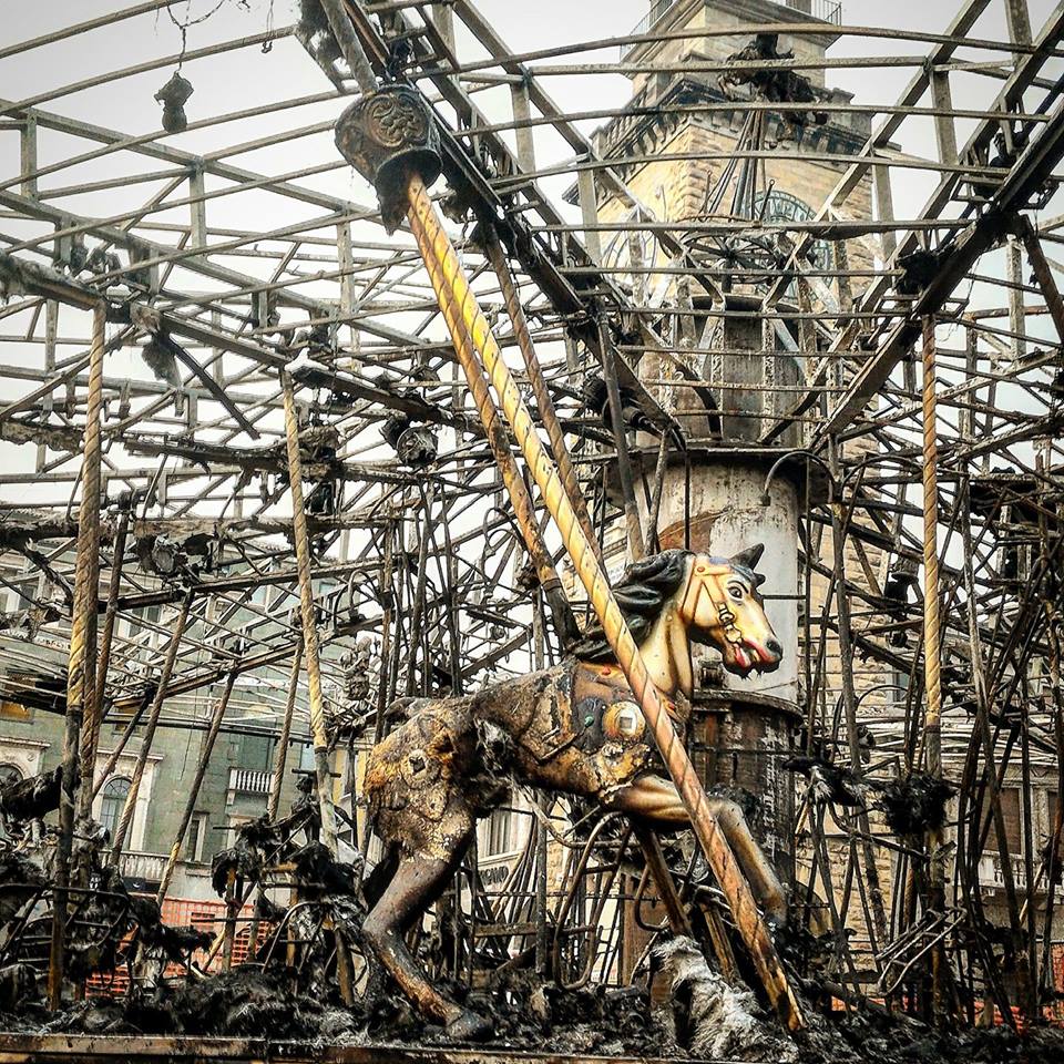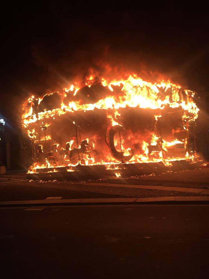 Sono le 19.30 del 22 novembre 2017. L’ora dell’aperitivo al bar Nazionale è squarciata da un botto tremendo: le fiamme si alzano al cielo e il crepitio sinistro del fuoco, in un batter d’occhi, manda in fumo il carosello di cavallini e le apparecchiature tecniche ed elettriche della giostra. Il proprietario Roberto Formaggia ha già chiuso. Lo richiamano da casa.