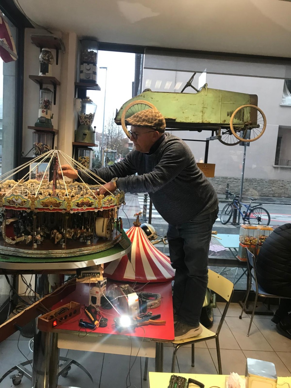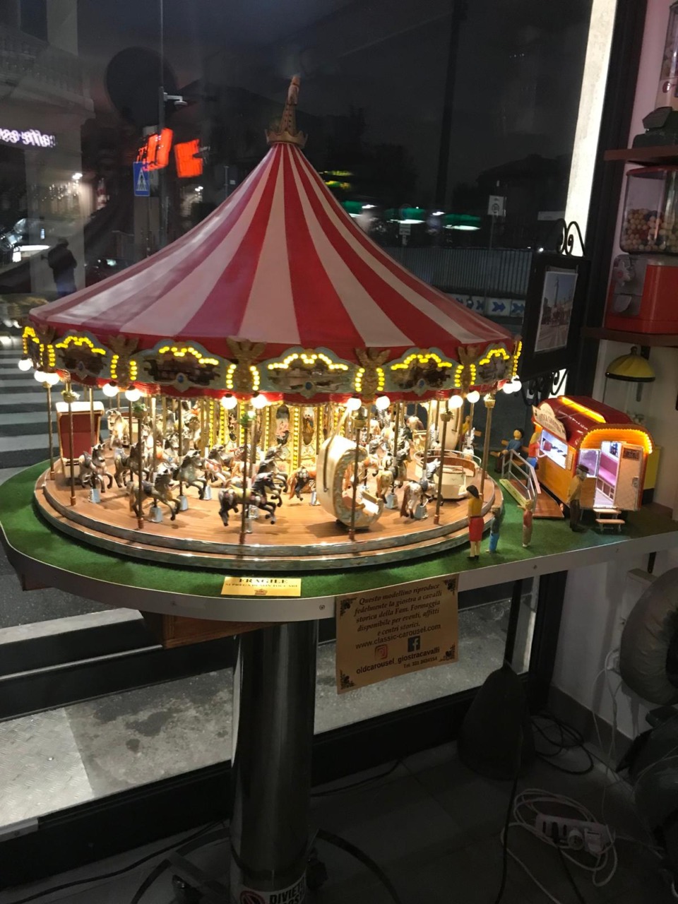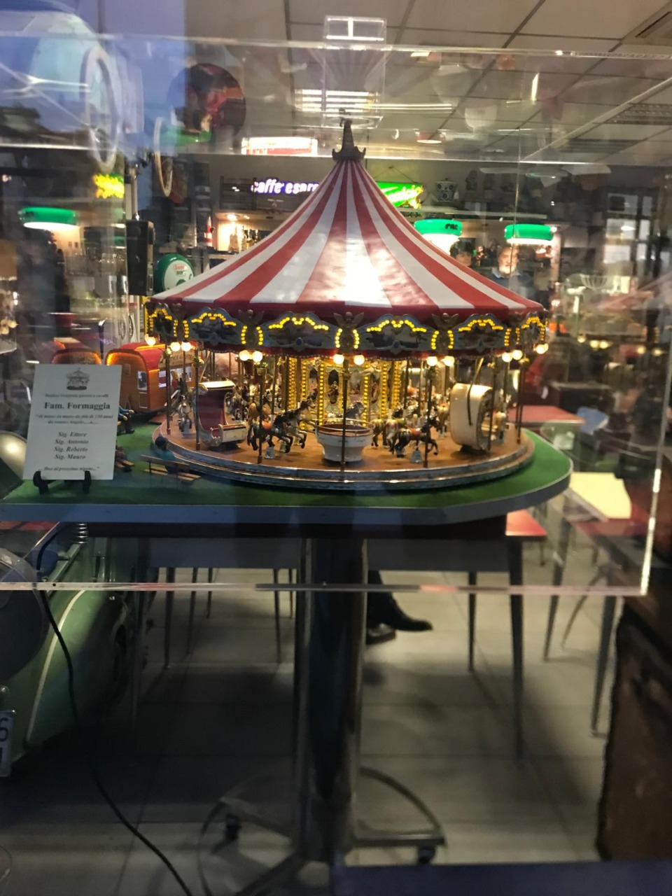 «Giuliana la prende in affitto. Vorrebbe comprarla – continua Matteo Invernici – ma la famiglia Formaggia preferisce noleggiarla, soprattutto nel periodo di Natale, ai grandi empori come ad esempio La Rinascente a Milano, dove fa bella mostra di sé nelle vetrine sfavillanti delle feste di fine anno. Mi faccio vivo io con il signor Formaggia. Ma è inutile. A ottobre dell’anno scorso torno da Giuliana. La giostra è lì, con la curiosità della gente che diventa invadenza: mani che si insinuano nella struttura, cappotti che vanno a sbattere senza volerlo nel basamento di sostegno. Dico a Giuliana: “La prendo io e la metto nel mio caffè”. Torno all’attacco del signor Formaggia. E stavolta la mia ostinazione viene premiata».