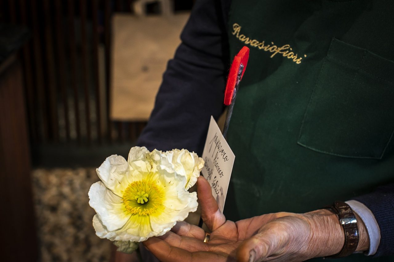 Per Adriano Ravasio, fiorista da oltre cinquant’anni, è come se ci stessimo disabituando alla bellezza: «Per me è stato facile riconoscerla, sono cresciuto giocando in una serra». Indubbiamente, la genetica ci ha messo del suo: fu per primo il prozio Ernesto ad appassionarsi di fiori, tanto che dopo aver studiato alla Scuola di Floricultura di Zurigo divenne, a inizio Novecento, giardiniere capo nella Villa Keller Steiner in Città Alta. Poi fu la volta di suo zio Eugenio – che negli anni della guerra lavorò come giardiniere presso la Santa Sede nello Stato Pontificio – e, infine, i fiori portarono fortuna anche a Vittorio, papà di Adriano. Spedito in un campo di prigionia in Sudafrica, ebbe in sorte l’incontro con una benestante signora di Johannesburg che lo fece lavorare per tutto il tempo come giardiniere nella propria casa. I fiori avevano salvato anche lui, tanto che il suo rientro in Italia tardò di due anni rispetto alla fine della guerra. Quando Vittorio tornò a casa, portò in tasca con sé alcuni semi di un fiore che aveva visto solo lì e del quale, probabilmente, avrebbe avuto nostalgia da quanto era bello. Si trattava di un papavero giallo e rosso che sembrava fatto di carta pregiata. Il signor Adriano ce lo mostra in negozio, lo tiene con delicatezza, lo guarda con gratitudine: «Fu proprio mio padre a diffonderlo prima in Italia e poi in Europa». E gli lasciò il suo simpatico nome inglese, Poppy, che portava con sé la dolcezza di un tempo buono.