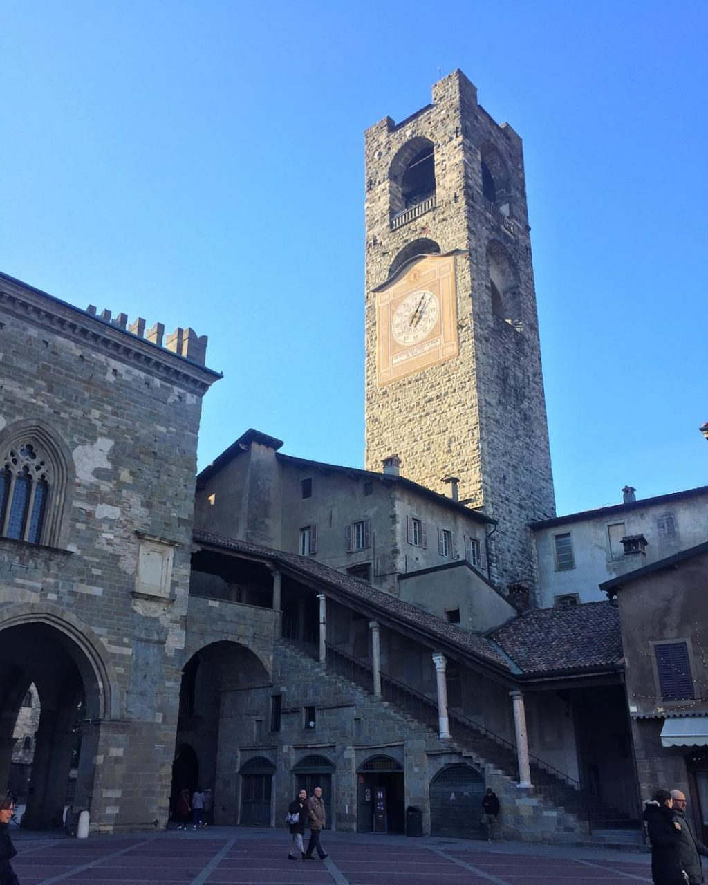 Sono ben dieci le fasi edilizie che ha affrontato il nostro Campanone (così è nota a noi bergamaschi questa struttura) nell’intervallo temporale che va dal 1001 al 1960, e l’altezza è partita da 37,70 metri per raggiungere oggi i 52,76 metri. Tra tutti i documenti consultati, spiccano pagamenti e rifornimenti in merito ai materiali, tra cui pietra, laterizi, sabbia, calce, legname, chiodi, mentre scarne sono risultate le notizie circa le maestranze e la manovalanza impiegata sia in termini numerici che qualitativi. L’edificio è già attestato nel 1197 come il “vicino” di Palazzo Suardi in Piazza Vecchia (oggi Casa Suardi) ed è comunque databile almeno alla metà del XII secolo: dalla torre dei Suardi-Colleoni con terminazione a quattro merli si giunse al primo sopralzo con arcate, poggianti sui merli (coperto forse a tetto) per poi procedere con il secondo sopralzo e la nuova cella campanaria intorno al XVI secolo e dopo aver superato molte avversità di natura atmosferica ed economica. Nel corso dell’Ottocento si assistette a molteplici opere di risanamento e di riparazione, fino all’ammodernamento del 1960 con l’introduzione dell’ascensore e agli ultimi interventi di qualche anno fa, che hanno interessato l’orologio e quindi la “campana” e la risalita. Al suo interno vi era una scala in legno, la porta d’ingresso in posizione elevata a circa quattro metri da terra e altre quattro che si disponevano su vari livelli nei fronti est, ovest e sud insieme a dei ballatoi lignei. La sua funzione rappresentativa e all’occorrenza anche difensiva la si legge nitidamente tramite l’ordinata tessitura muraria, lungo cui si scorgono conci ben squadrati e lavorati sugli spigoli esterni a bisello, simili a quelli delle torri gentilizie del Gombito tra via Mario Lupo e Gombito e di Adalberto in Largo Colle Aperto.