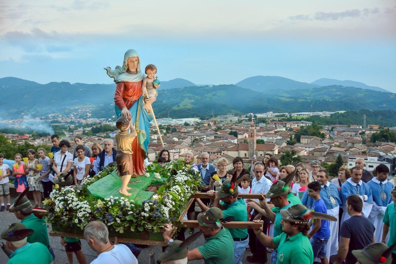 Il 5 e 6 agosto di ogni anno il paese è in festa, in quanto ricorrono gli anniversari delle due apparizioni mariane legate al Santuario, datate rispettivamente 1550 e 1839. «Secondo la tradizione – spiega lo studioso locale Natale Bonandrini – nel 1550, presso la cascina di un contadino si trovava un’immagine raffigurante la Madonna, per accedere alla quale i pellegrini calpestavano l’erba del campo. Il contadino, infastidito, sfregiò a colpi di zappa il dipinto che, nella notte del 5 agosto, per incanto ricomparì. Una seconda apparizione avvenne il 6 agosto 1839, quando il piccolo Luigi Rossi fu accudito dalla Madonna durante un temporale, rifocillato dalla Vergine con del pane e ritrovato incolume dal padre, incredulo di trovarlo nel fienile che lui stesso aveva chiuso poche ore prima».