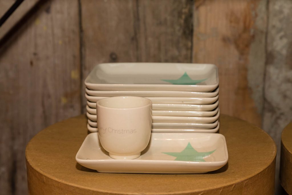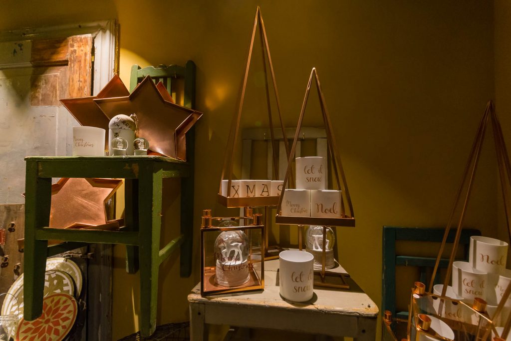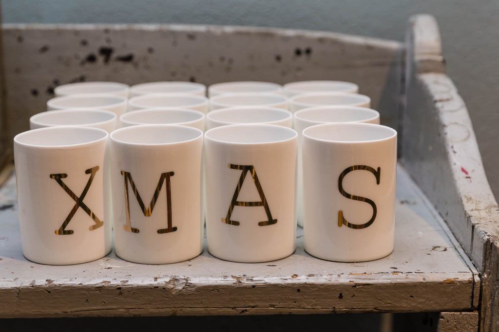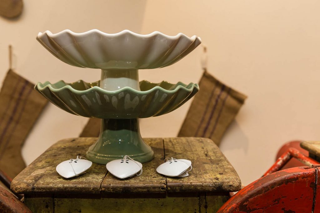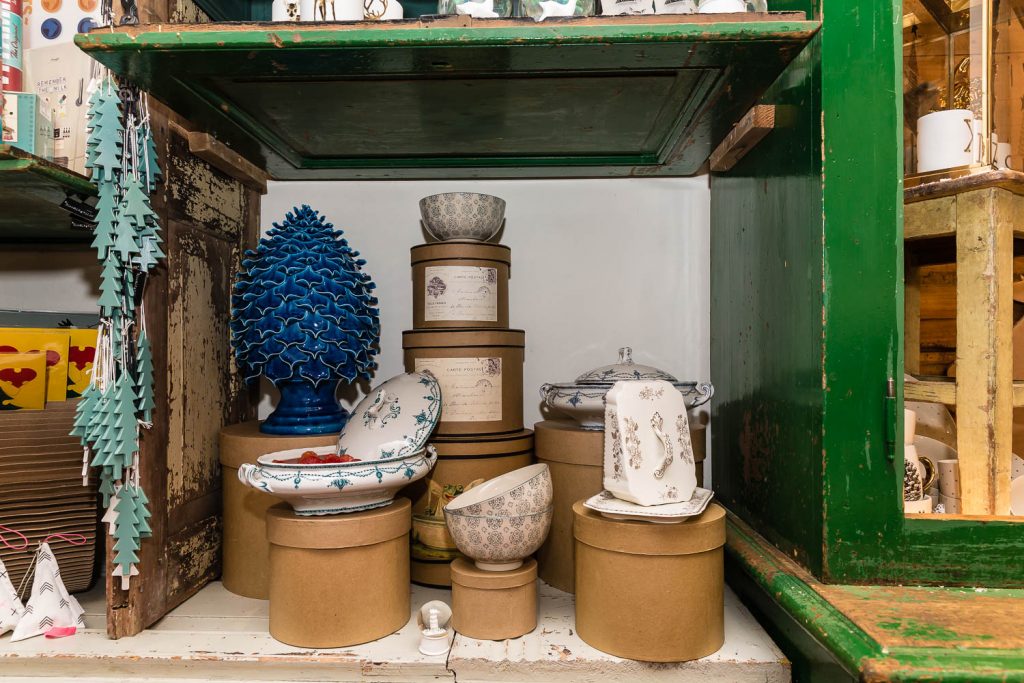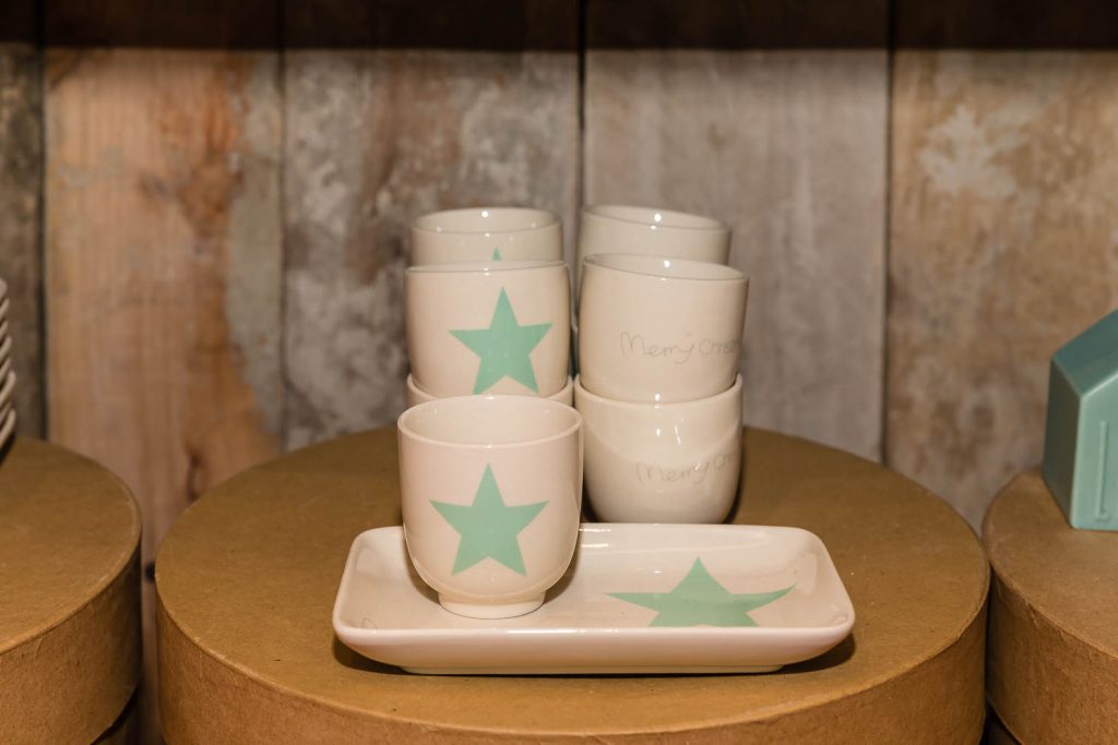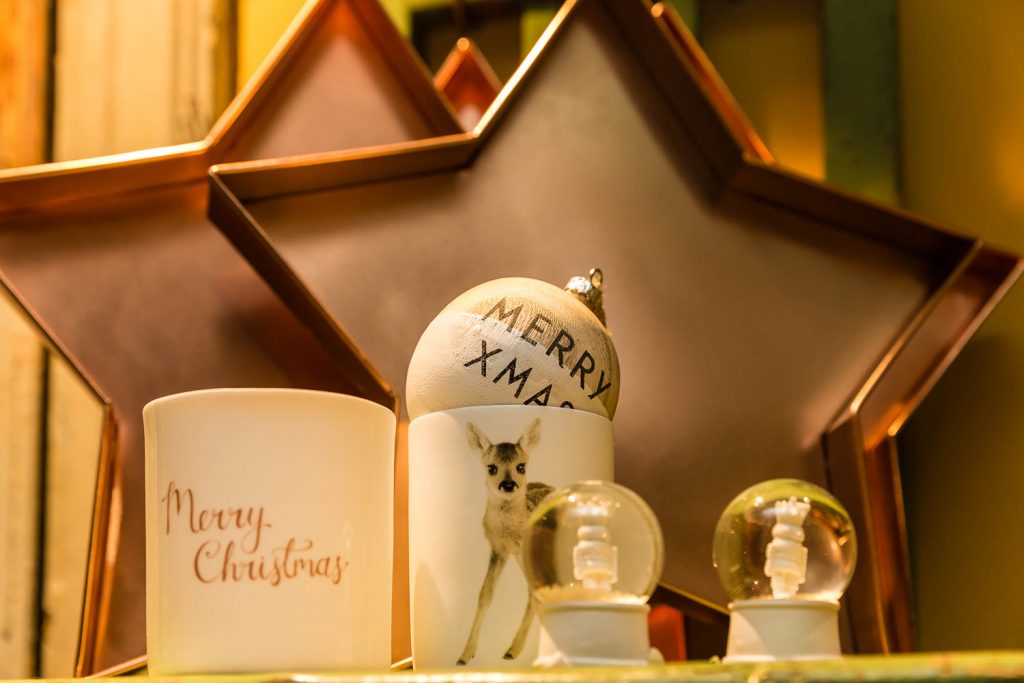 «Natale è il piacere di augurarsi cose belle, è il lusso di godersi le persone a cui vogliamo bene in un’atmosfera che ci fa sentire sempre un po’ bambini», dice Andrea. Un pensiero condiviso anche da Angelo, che aggiunge: «Natale è la voglia di ritrovarsi, di mangiare cose buone, di coccolarsi un po’, di fare e ricevere un regalo inaspettato». Quale posto migliore per trarre ispirazione natalizia se non in questa fucina d’idee di 100 metri quadrati su due livelli? «Il nostro obiettivo è proporre un’immagine innovativa ed esclusiva del Natale. Oltre ai tradizionali colori rosso e oro, che simboleggiano le festività invernali, proponiamo tonalità calde come il rame e il bronzo, alternate a nuance prese in prestito dai Paesi scandinavi, come il verde menta, il nero e il bianco, per un effetto chic e contemporaneo» specifica Lorenzi. Pochi e selezionatissimi fornitori compongono il portfolio di aziende, incaricate di render memorabili le prossime feste: l’oggettistica danese firmata Bloomingville, la linea casa Ib Laursen e tante idee per decori e pensieri, come i set per la colazione, le tazze a tema, i tovaglioli con stampe bene auguranti, le cappelliere cilindriche e ovali, i biglietti d’auguri personalizzati, le candele dell’avvento e le palline per l’albero di Natale in vetro o ceramica. «Il nostro fiore all’occhiello sono le ceramiche prodotte da noi a marchio Amarcord, realizzate a mano da un laboratorio artigianale emiliano sui nostri disegni e dipinte con i colori scelti da noi» continuano i titolari.
