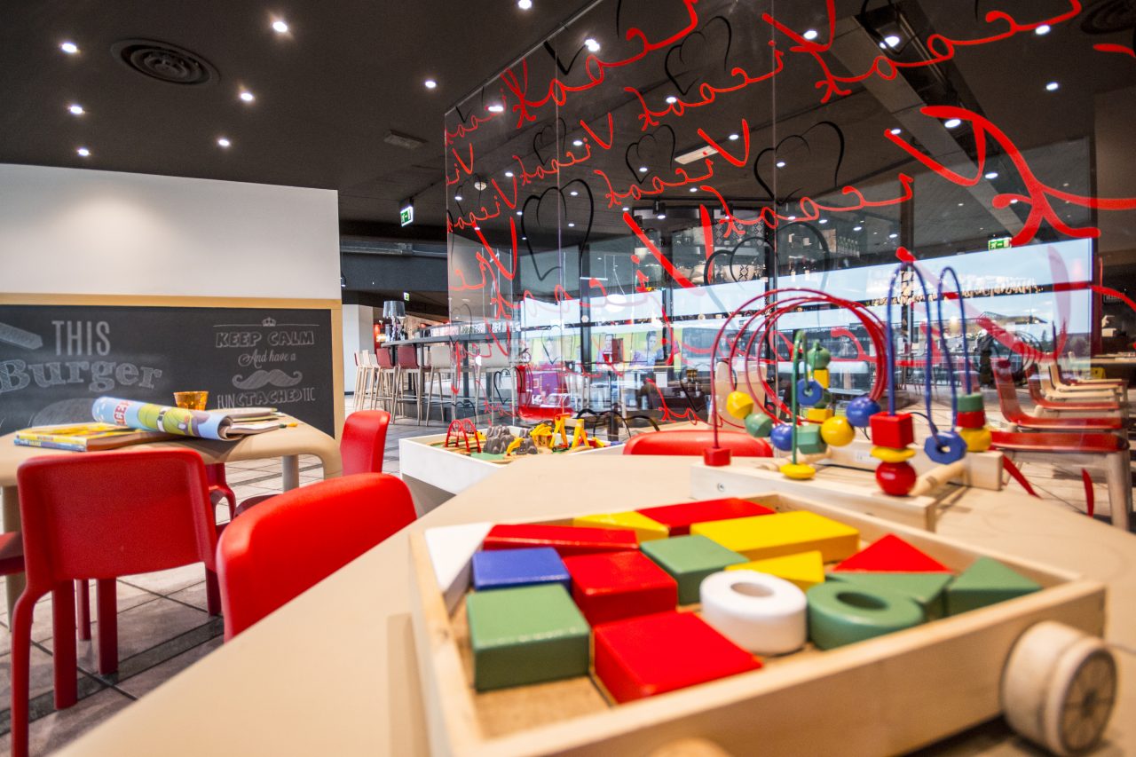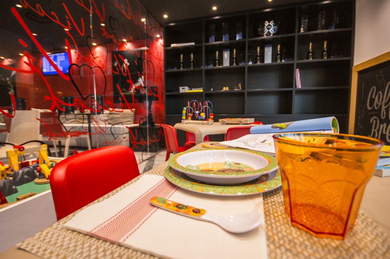La sala meeting e la sala bimbi. Sul lato opposto una spettacolare vetrata corre lungo tutta la parete. Qui si trovano la saletta dedicata alle famiglie, arredata con qualche gioco per intrattenere i bambini, e una sala meeting, con un grande tavolo reale, sfruttata principalmente per riunioni, cene importati e feste.