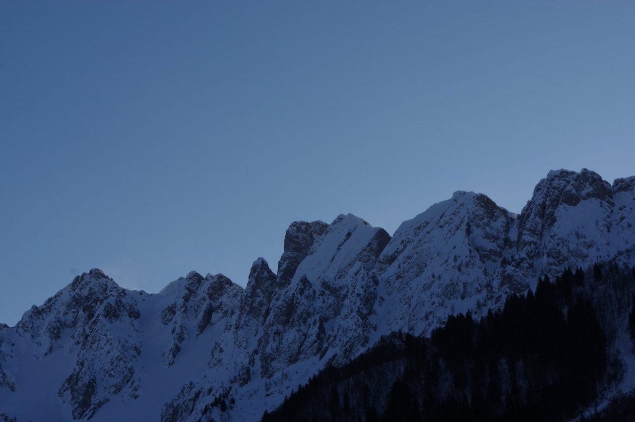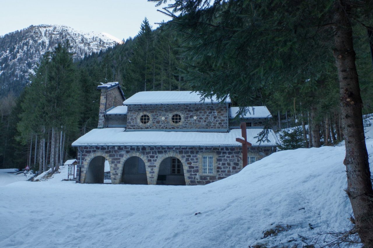 La Conca dei Campelli. Un’ora di facile cammino e raggiungiamo il rifugio Cimon della Bagozza (m.1600). La struttura, ex baracca di minatori, è gestita da oltre vent’anni da Silvio Visini ed è aperta tutti i giorni, estate e inverno (per informazioni: 3493016270). Una tappa per un caffè e una fetta di torta sono quasi un obbligo. All’ingresso troviamo una stufa centenaria sempre accesa, mentre un cartello posto all’esterno della struttura ricorda che al Bagozza troveremo sempre della «polenta e chél che ghè». Abbandonato il tepore del rifugio (e i suoi profumi), possiamo continuare la nostra escursione. Il tracciato, sempre ben battuto, continua alternando facili salite a tratti in falsopiano. Metro dopo metro, il panorama si apre sulle montagne, tra le quali spicca il Cimone della Bagozza. Con calma, gustando la meraviglia offerta dal paesaggio, raggiungiamo la Madonnina dei Campelli, simbolo di questa valle. Alla nostra destra una traccia scende per poi risalire ripida in direzione del Cimone, montagna che in questa stagione è relegata ai soli alpinisti. La ignoriamo e continuiamo sul tracciato principale. Se siamo partiti di primo mattino il sole inizierà a fare capolino dalle montagne mostrando, tra riflessi e luccichii, tutte le meraviglie della conca.