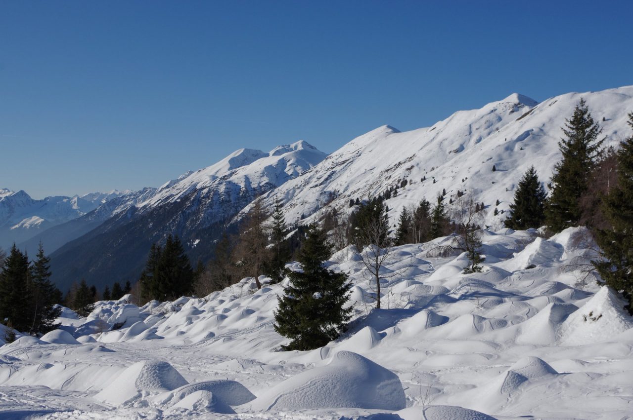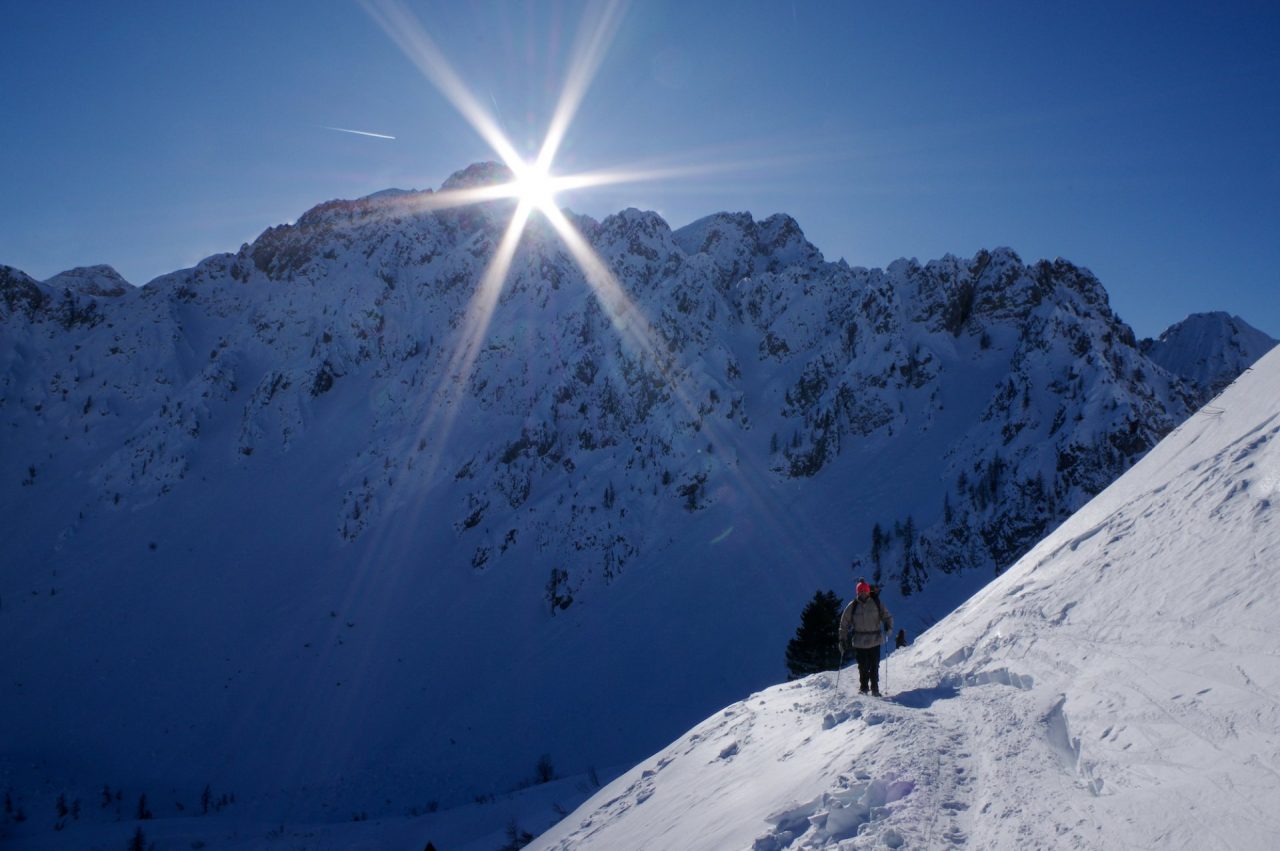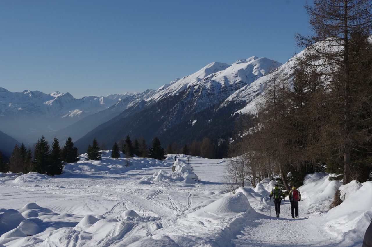 La partenza. L’escursione vede la sua partenza dalla località Fondi di Schilpario, al limite delle nostre Alpi Orobie. Tra questi bianchi pendii convivono tranquillamente ciaspolatori, scialpinisti ed escursionisti, attratti dalle meraviglie che l’altopiano regala durante la stagione invernale. Attraversato il paese, proseguiamo lungo la strada del Vivione, ora completamente innevata, fino a raggiungere i parcheggi a pagamento ricavati tra le muraglie di neve. Inizia qua la nostra escursione, inizialmente lungo la strada carrozzabile che risale i pendii innevati tra baite e casolari. Tutto è ricoperto dal bianco mantello e a ogni passo la neve aumenta sempre più, ricoprendo quella che, durante la stagione estiva, è una strada piena di vita e persone. Se abbiamo ciaspole o sci ai piedi, possiamo seguire le tracce che tagliano i tornanti, oppure possiamo concederci una passeggiata lungo la carrabile colma di neve e battuta ogni giorni dai tanti escursionisti che raggiungono questa bellissima zona.