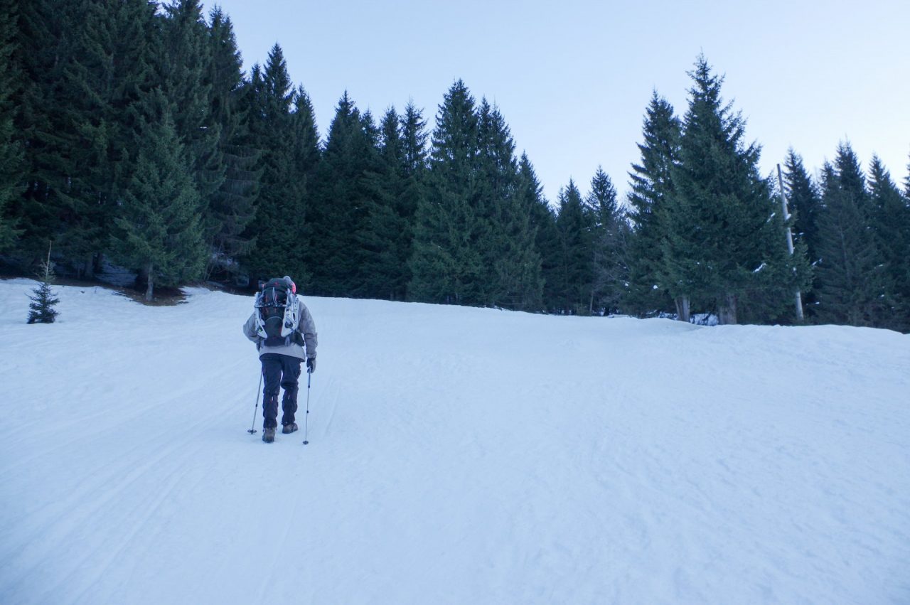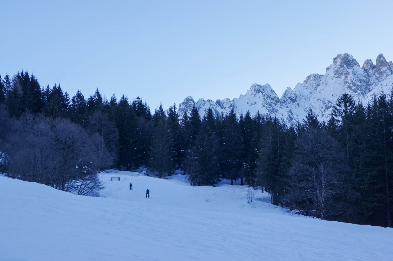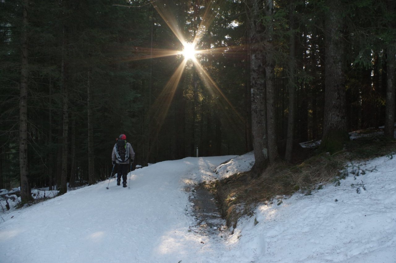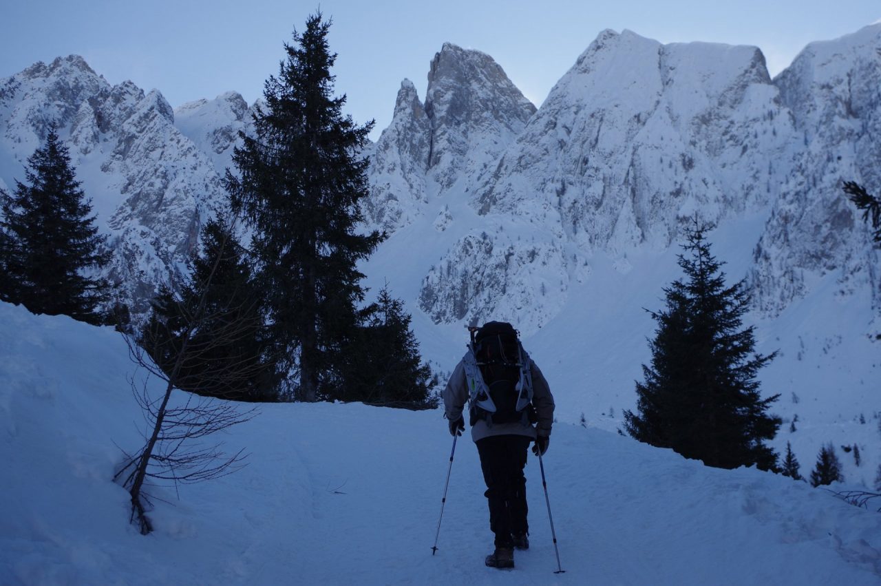 La partenza. L’escursione vede la sua partenza dalla località Fondi di Schilpario, al limite delle nostre Alpi Orobie. Tra questi bianchi pendii convivono tranquillamente ciaspolatori, scialpinisti ed escursionisti, attratti dalle meraviglie che l’altopiano regala durante la stagione invernale. Attraversato il paese, proseguiamo lungo la strada del Vivione, ora completamente innevata, fino a raggiungere i parcheggi a pagamento ricavati tra le muraglie di neve. Inizia qua la nostra escursione, inizialmente lungo la strada carrozzabile che risale i pendii innevati tra baite e casolari. Tutto è ricoperto dal bianco mantello e a ogni passo la neve aumenta sempre più, ricoprendo quella che, durante la stagione estiva, è una strada piena di vita e persone. Se abbiamo ciaspole o sci ai piedi, possiamo seguire le tracce che tagliano i tornanti, oppure possiamo concederci una passeggiata lungo la carrabile colma di neve e battuta ogni giorni dai tanti escursionisti che raggiungono questa bellissima zona.