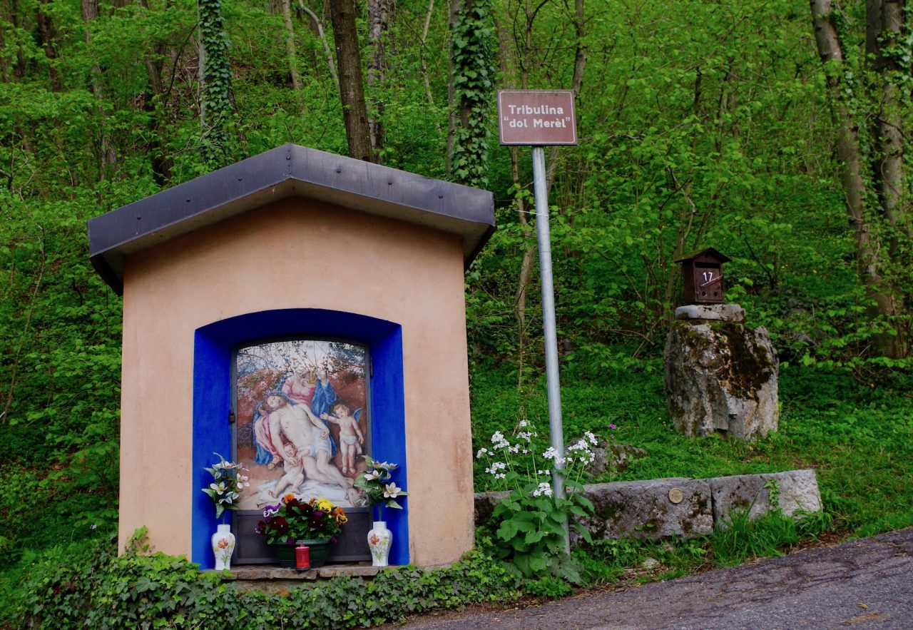 Partenza da Vertova. Il via alla nostra escursione è il centro del paese di Vertova, famoso per le cascate cristalline che durante la stagione estiva attirano centinaia di visitatori nell’omonima valle. Posteggiamo l’auto nel centro del paese, più precisamente in piazza Vittorio Veneto, dove il segnavia CAI 518 indica il via alla nostra escursione. Il sentiero imbocca via Brini e sale lungo una ripida scalinata, continuando successivamente lungo via Moracchio. La bandiera bianco-rossa ci invita a piegare a sinistra e, in leggera ascesa, raggiungiamo via San Patrizio. Ed ecco che ai nostri occhi si presenta la prima santella della giornata: la “Tribulina del Merel”. Noi proseguiamo lungo la mulattiera che sale in direzione del santuario, baluardo panoramico sulla media Val Seriana, conosciuto anche per le tante leggende legate al santo irlandese. Vale la pena concedersi qualche minuto, anche per riempire le borracce e assaporare la fresca acqua che sgorga dalla fontana adiacente alla struttura. Accanto al santuario si apre un pozzo, conosciuto come “la Tamböra de San Patrésse”, che penetra nella cavità del vicino monte Cavlera. Secondo la leggenda scende fino a raggiungere il fiume Serio e si dice che, accostando l’orecchio alla cavità, si possa udire il rumore del fiume che scorre impetuoso.