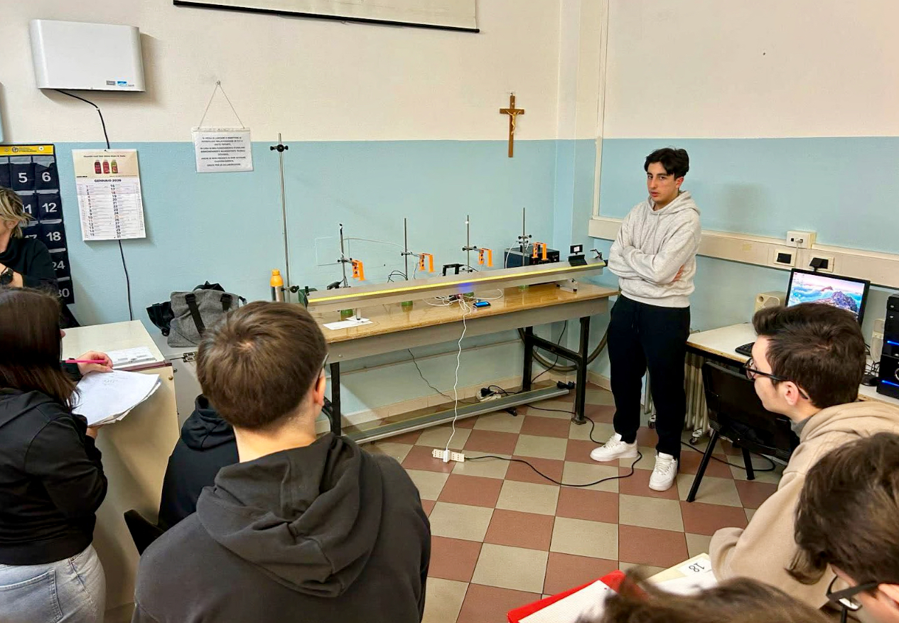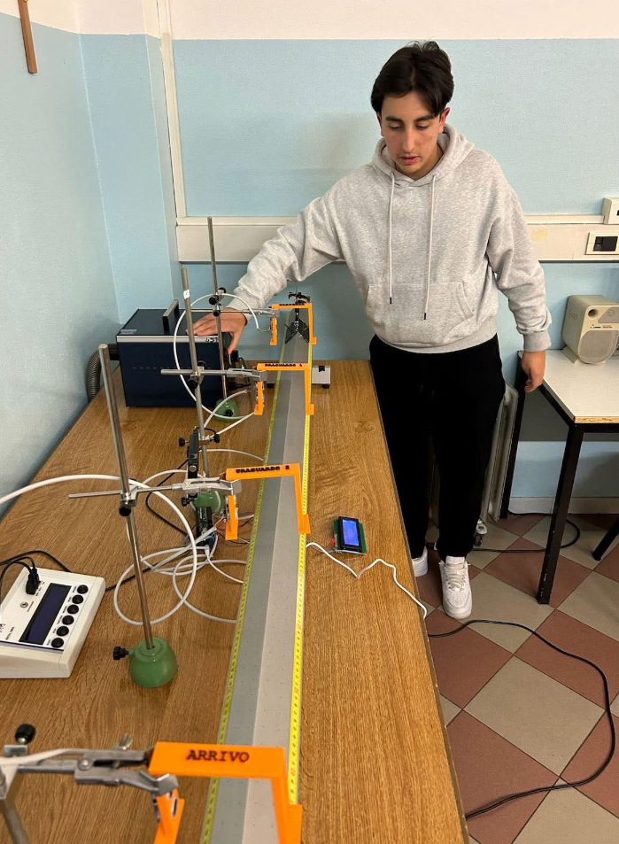 Un esempio recente arriva dalla 2ª B Scientifico, che ha affrontato l’esperimento sul moto rettilineo uniformemente accelerato in un modo davvero originale. Invece dei kit tradizionali, i ragazzi hanno utilizzato sensori e sistemi di raccolta dati progettati e realizzati da Alessandro, uno studente dell’indirizzo Elettronica-Elettrotecnica sotto la guida del docente Salvatore Traina.