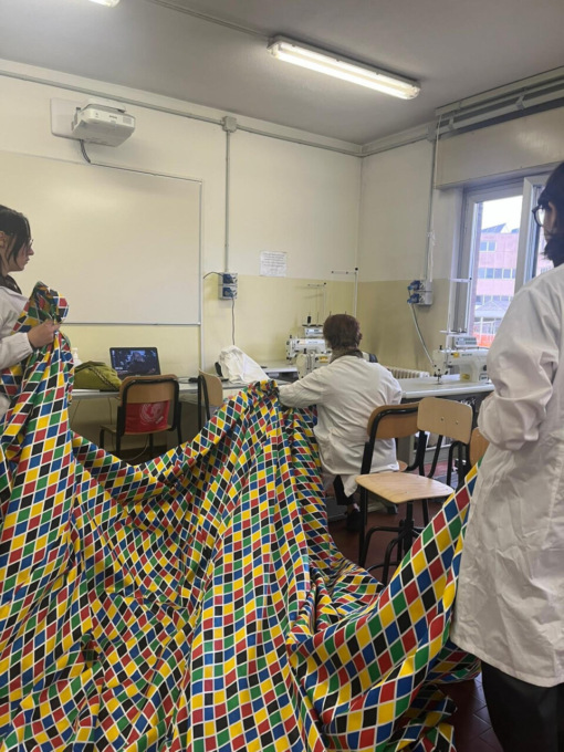 «Le difficoltà – spiegano le docenti del Caniana – nella realizzazione dello strascico sono state diverse: l’avere poco tempo a disposizione, l’enorme quantitativo di stoffa che ha richiesto la collaborazione di almeno 5 studenti che reggessero il tessuto dei vari pannelli durante la cucitura e ha portato ad un risultato che ha soddisfatto tutti. Ciononostante questa sfida si è rivelata molto appagante. La collaborazione a classi aperte tra studenti e docenti di moda è stata positiva e concreta. Il quantitativo di stoffa utilizzato è stato di circa 60 metri e sul palco son servite ben 6 studentesse dell’Istituto per aiutare l’attrice a trasformare questa “Arlecchina moderna” lasciando tutti a bocca aperta!».