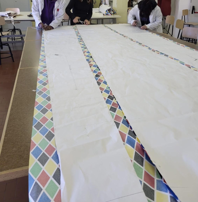 Dopo la selezione dei bozzetti, la fase operativa e laboratoriale è stata coordinata dalla docente di laboratorio Giuseppina Pagnoncelli, che con la collaborazione di molti docenti e studenti ha realizzato il cartamodello e il capo.
