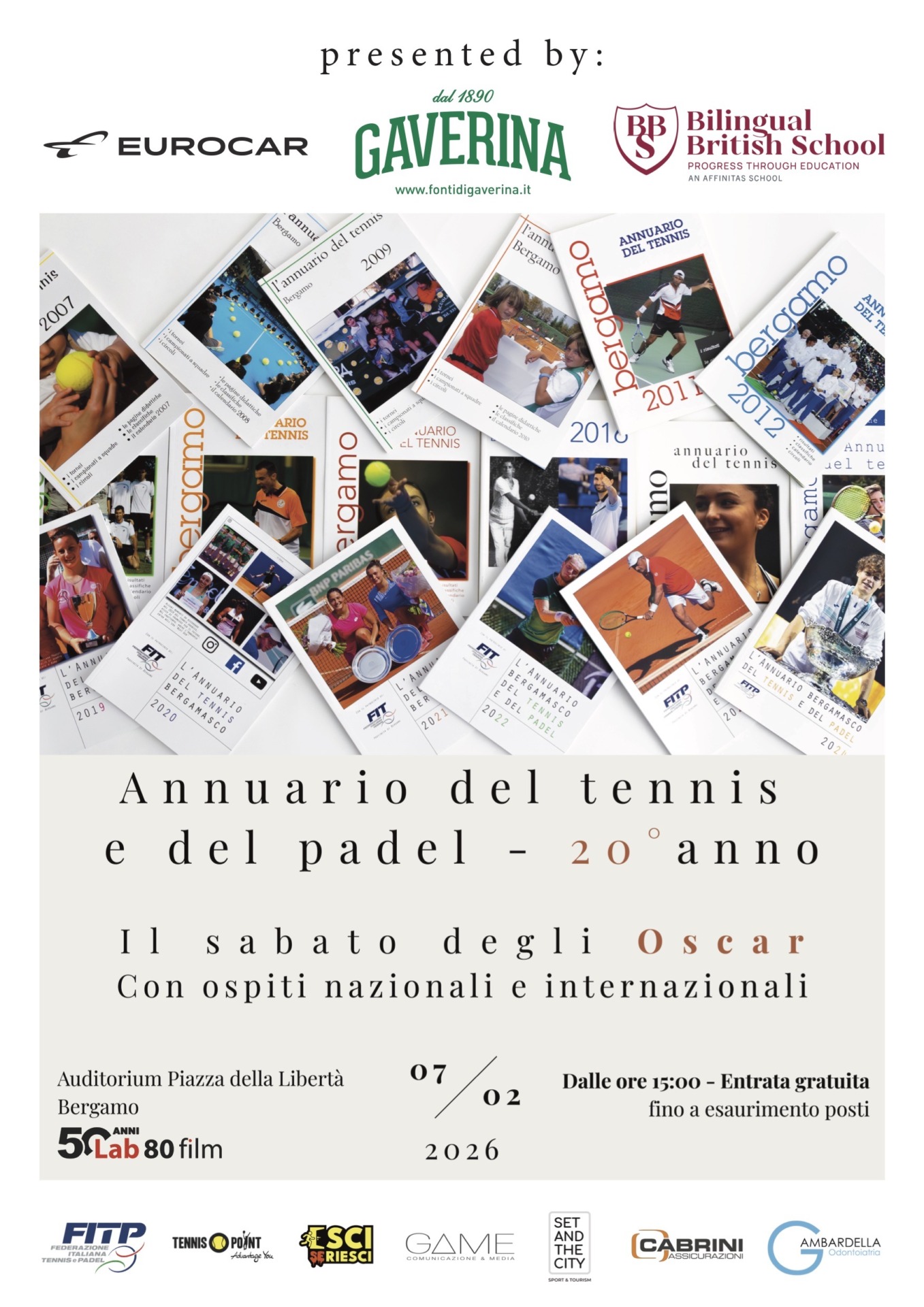 In totale saranno dodici i premiati, dagli Under agli Over, passando per le squadre, con un’attenzione particolare dedicata al sociale e all’inclusione. L’evento sarà anche l’occasione per svelare la ventesima edizione dell’Annuario bergamasco del tennis e del padel, pubblicazione nata nel 2007 che raccoglie tutti i risultati della stagione nei due sport, proponendo inoltre una vetrina promozionale per i club di città e provincia. Stampata quest’anno in quattromila copie, prevede in aggiunta circa settemila download della versione digitale (totalmente gratuita) e nei 20 anni di storia del volume ha coinvolto oltre centomila lettori.