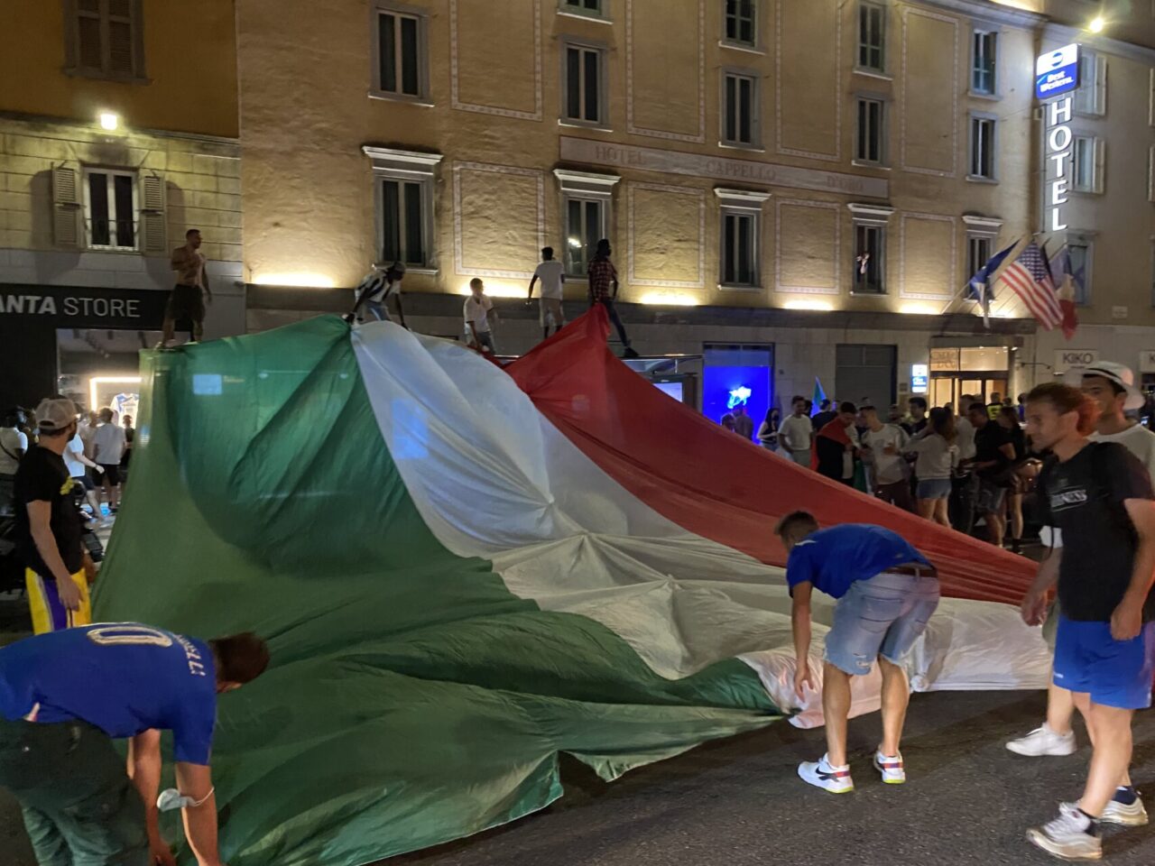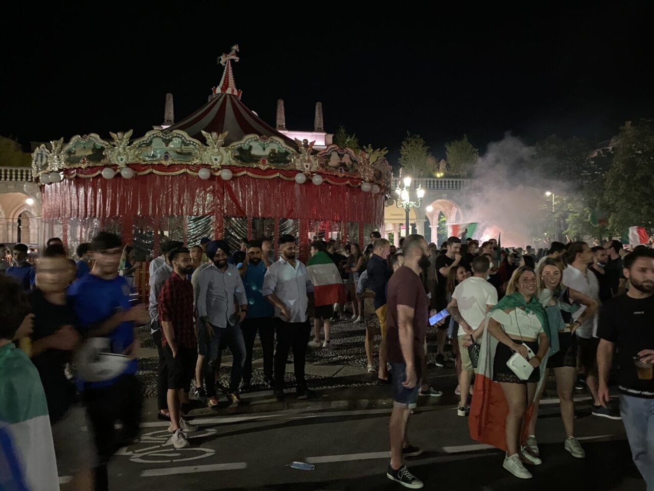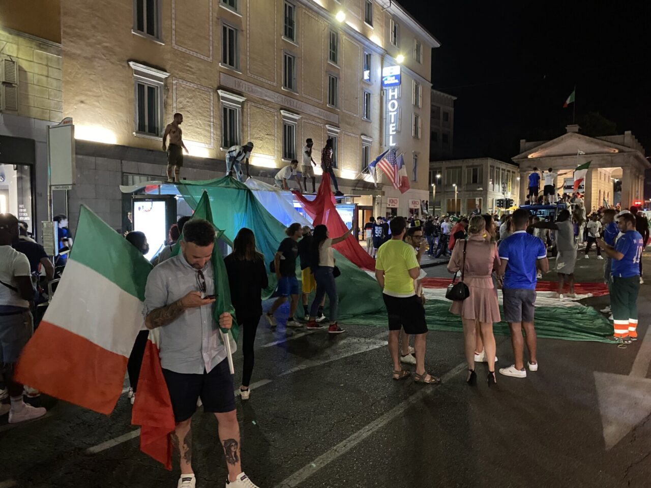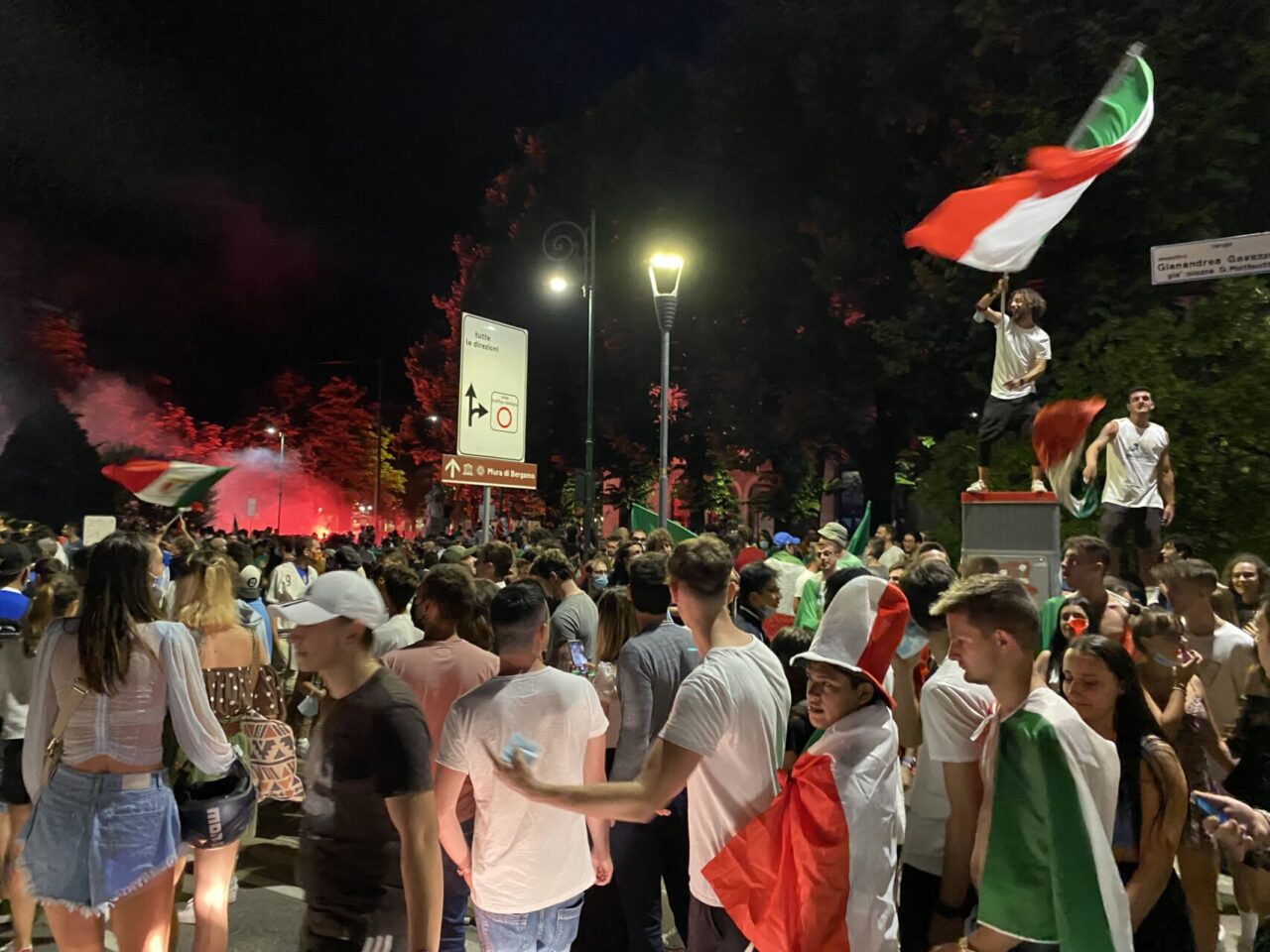 In tanti sono usciti di casa da soli, che tra le mura non ci potevano stare. Una bandiera, una bicicletta e via: ne abbiamo visti un bel po’ così, anche in periferia. E i monopattini, ormai entrati di diritto nel novero dei mezzi di trasporto più utilizzati, hanno fiancheggiato auto e scooter nei caroselli per le vie del centro. Dove c’è finita tanta gente, in ogni modo: un rito collettivo che si ripete, ad ogni vittoria, e che solo il calcio riesce a realizzare con tale successo.