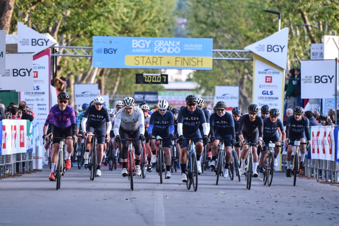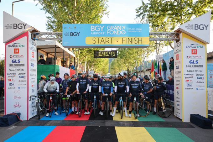 Cinque minuti e una manciata di secondi. Tanto ci è voluto per far sfilare i 2.300 ciclisti che ieri mattina, domenica 5 maggio, alle 7 in punto sono scattati da via Marzabotto per partecipare alla seconda edizione della Bgy Airport Granfondo (ex Felice Gimondi).