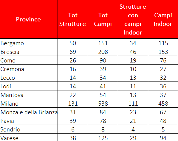 Milano resta la capofila con 131 club e 538 campi (di cui 458 indoor), ma dietro la metropoli ci sono province che crescono a ritmi altissimi. Brescia con 69 strutture e 208 campi, Bergamo con i suoi 50 club, e poi Pavia (39 strutture, 78 campi), Varese (38 e 125), Monza e Brianza (31 e 84).