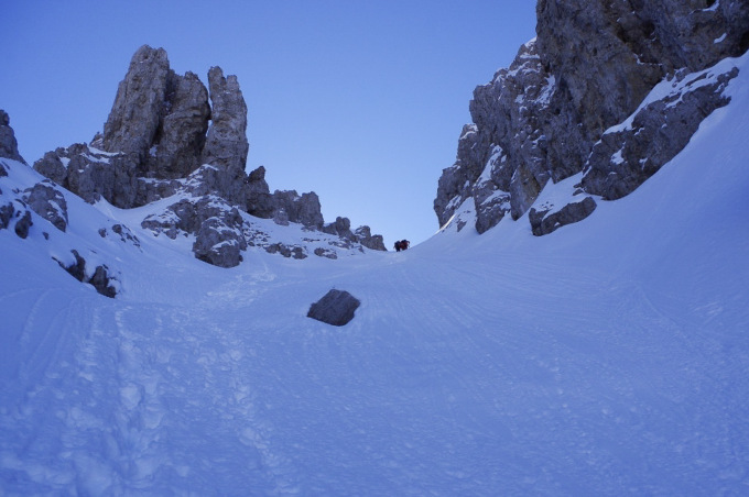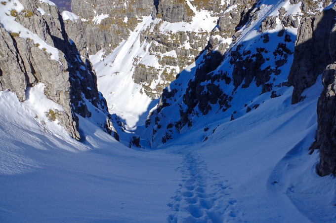 Raggiunto il comprensorio sciistico, il panorama si apre sulla valle innevata, mostrando alle nostre spalle la severa sagoma dello Zuccone Campelli. Noi, magari dopo una fetta di torta in rifugio, possiamo proseguire verso est, addentrandoci nel bianco Paradiso conosciuto come Vallone dei Camosci…