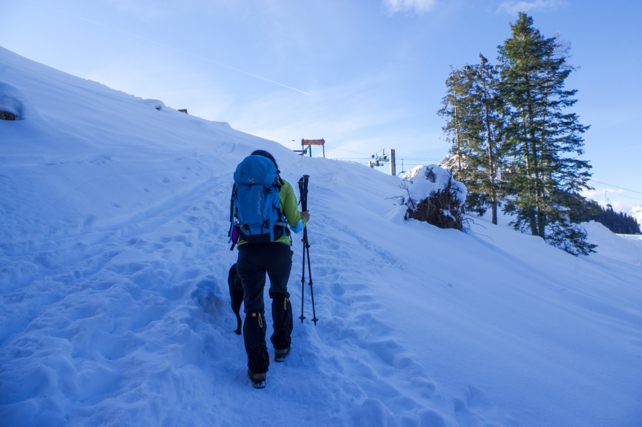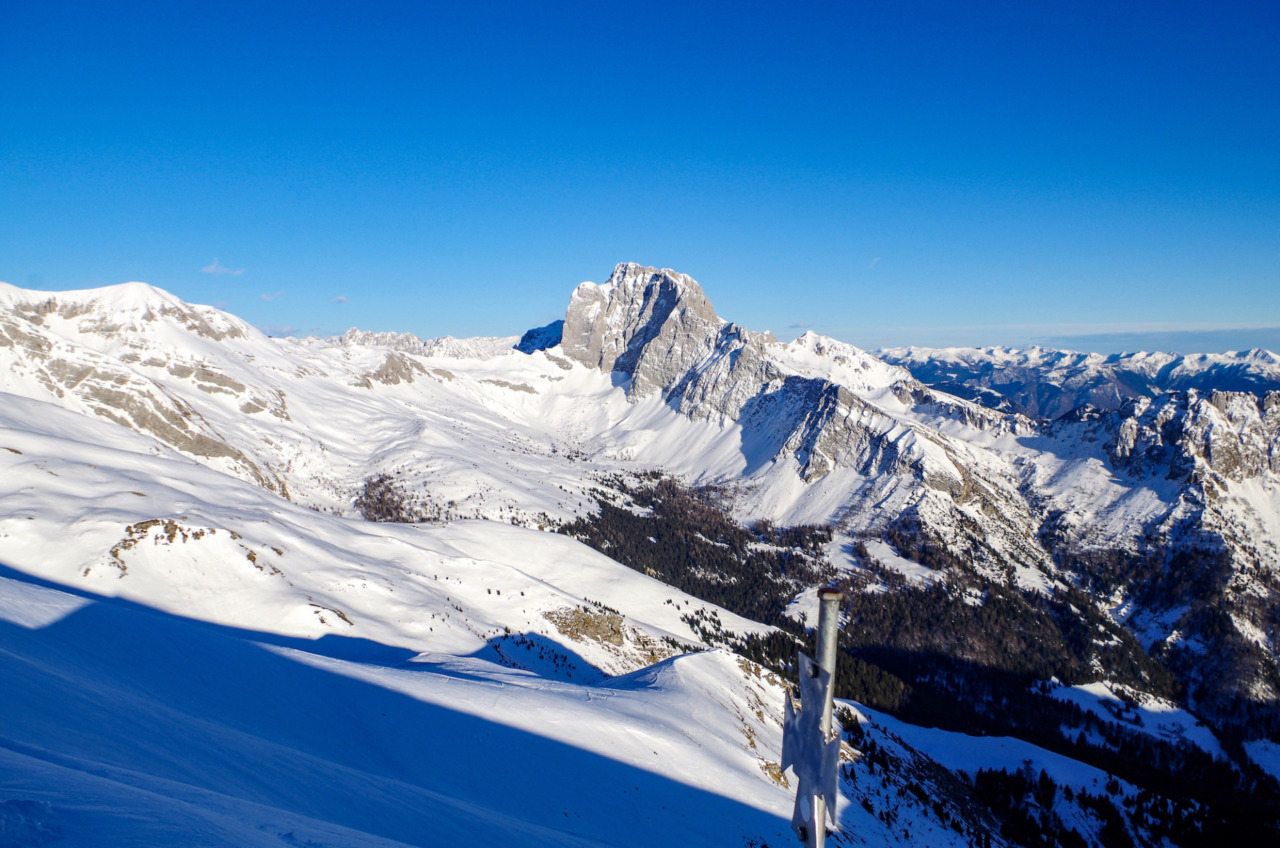 Passo dopo passo, restando fedeli alle tracce di chi ci ha preceduto, raggiungiamo la caratteristica Baita Pegherola, spesso coperta da una spessa coltre di neve. Usciti dal bosco, il panorama si apre di nuovo; non resta che un ultimo sforzo, necessario per raggiungere la sella che ospita il rifugio Vodala, nonché punto di arrivo della seggiovia.
