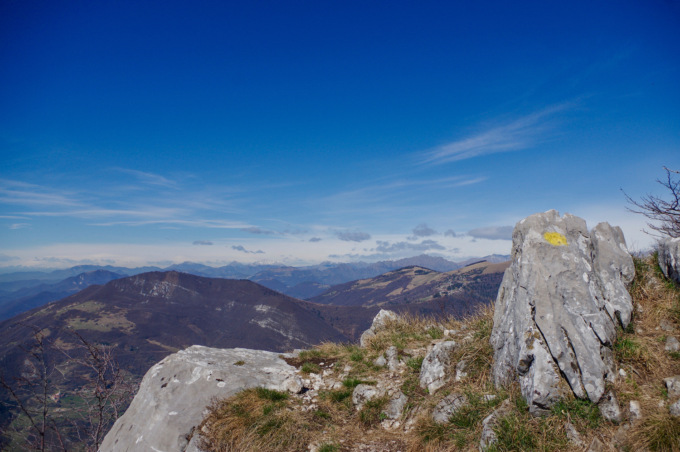 Recuperate le energie, lasciamo la vetta alla nostra sinistra proseguendo lungo il sentiero, raccordandoci al segnavia Cai 701 che con chiare indicazioni prosegue in direzione del Monte Bronzone…