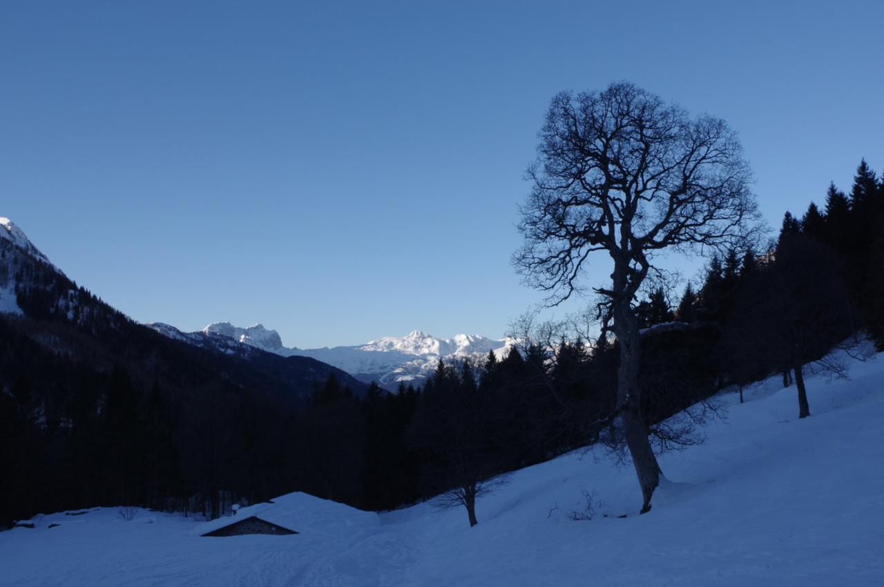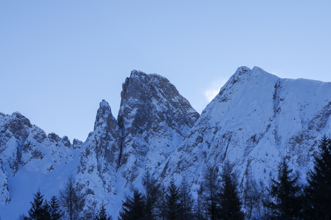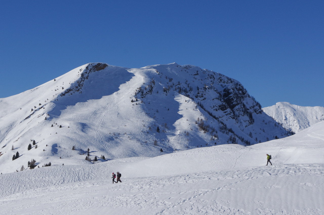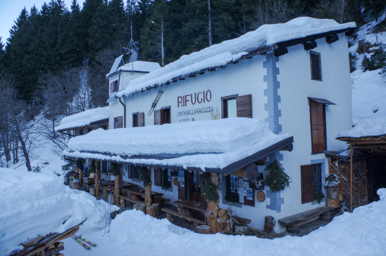 Se abbiamo ciaspole o sci ai piedi possiamo seguire le tracce che tagliano i tornanti, oppure possiamo concederci una passeggiata lungo la carrabile, battuta ogni giorni dai tanti escursionisti che raggiungono la zona. Un’ora di facile cammino e raggiungiamo il Rifugio Cimon della Bagozza (m. 1.600). La struttura, ex baracca di minatori, è gestita dalla famiglia Visini ed è aperta tutti i giorni, estate e inverno (per informazioni: 349.3016270). Una tappa per un caffè e una fetta di torta sono quasi un’obbligo.