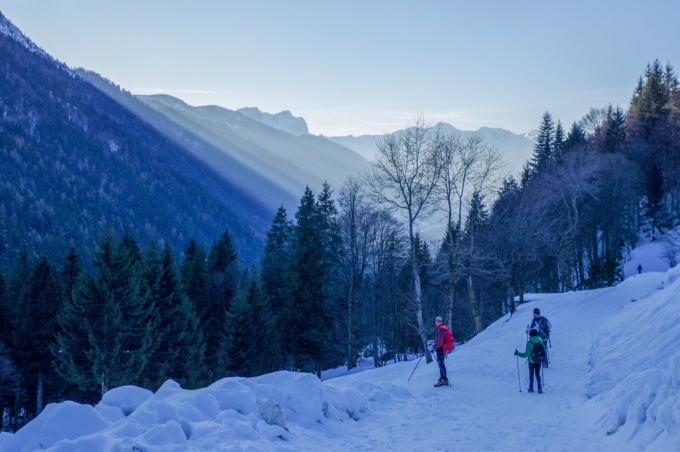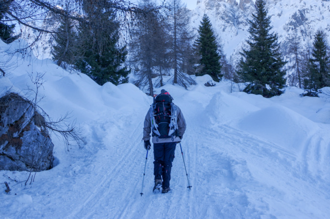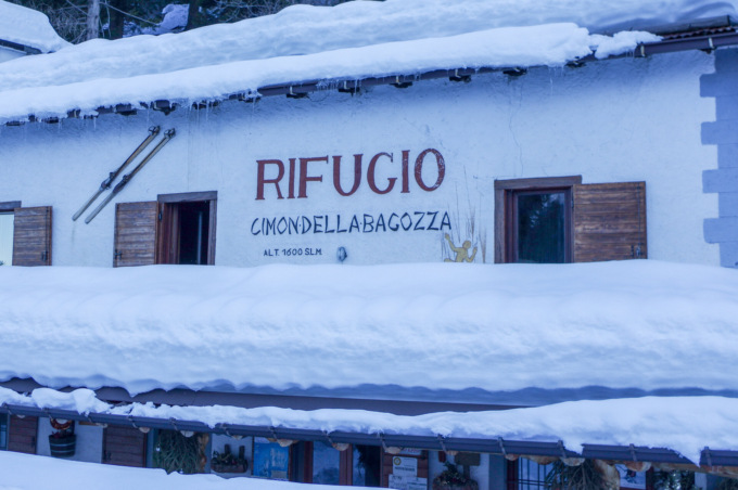 Ciaspole ai piedi, imbocchiamo la strada carrozzabile, che risale i pendii innevati tra baite e casolari: tutto è ricoperto dal bianco mantello e il paesaggio diventa, a ogni passo, sempre più fiabesco. Dopo un’ora di facile cammino, raggiungiamo il Rifugio Cimon della Bagozza, posto a circa 1.600 metri di altitudine.