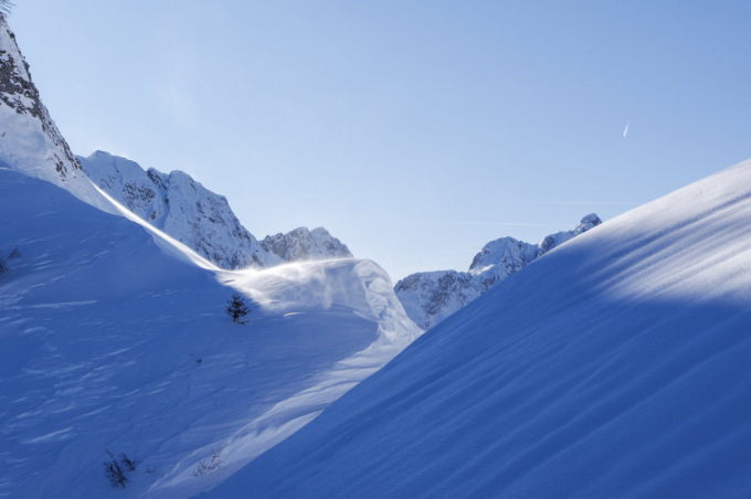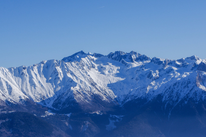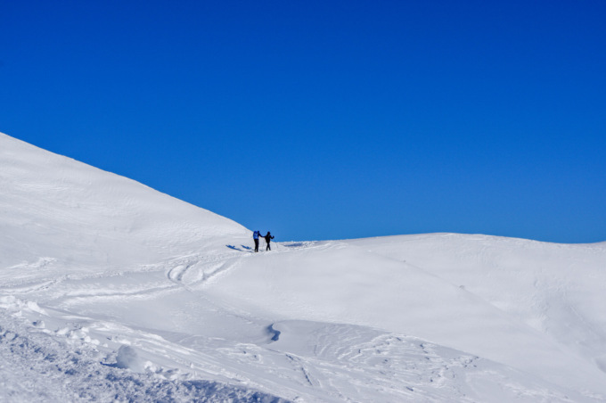 Assaporando la meraviglia offerta dal paesaggio, raggiungiamo la Madonnina dei Campelli, simbolo della valle. Alla nostra destra una traccia scende in direzione del Cimone, montagna che in questa stagione è relegata ai soli alpinisti. La ignoriamo e continuiamo sul tracciato principale. Se siamo partiti di primo mattino, il sole inizierà a fare capolino dalle montagne, mostrando, tra riflessi e luccichii, tutte le meraviglie della conca. Siamo in un ambiente spettacolare, dove neve e sole dipingono paesaggi da cartolina…