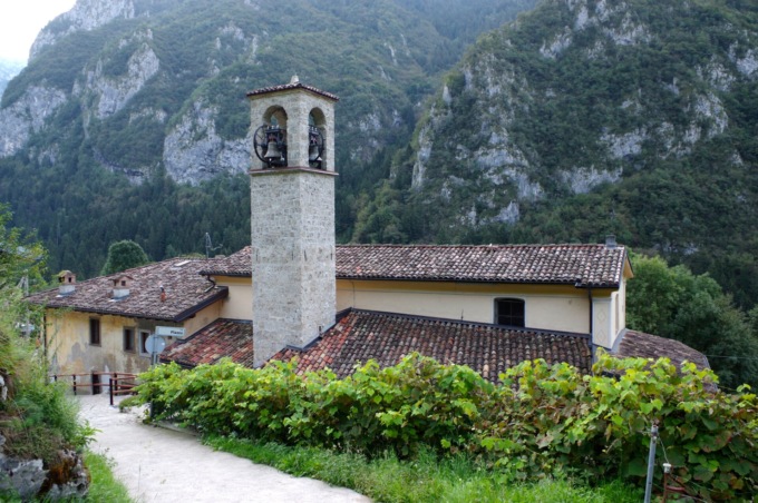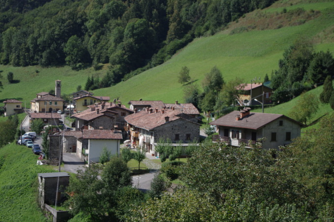 In poco meno di un’ora di cammino raggiungiamo il borgo di Colle Palazzo: posto a 1.267 metri è una delle località più belle di tutta la Valle Azzurra. In anni passati fu luogo di commercio e mercato, famoso per il bestiame, la lana e i formaggi, attirando genti da tutte le valli bergamasche. Qui una pausa è d’obbligo; ancora oggi sui muri dei cascinali ristrutturati capeggiano affreschi e icone, alcune risalenti al 1500.