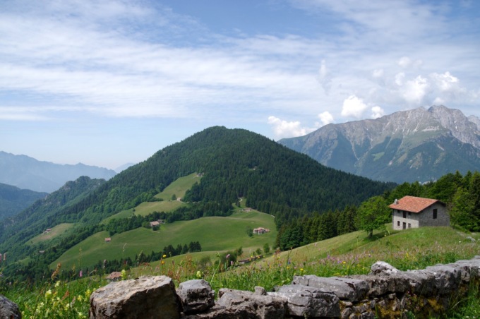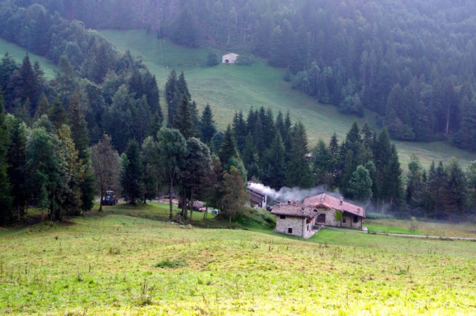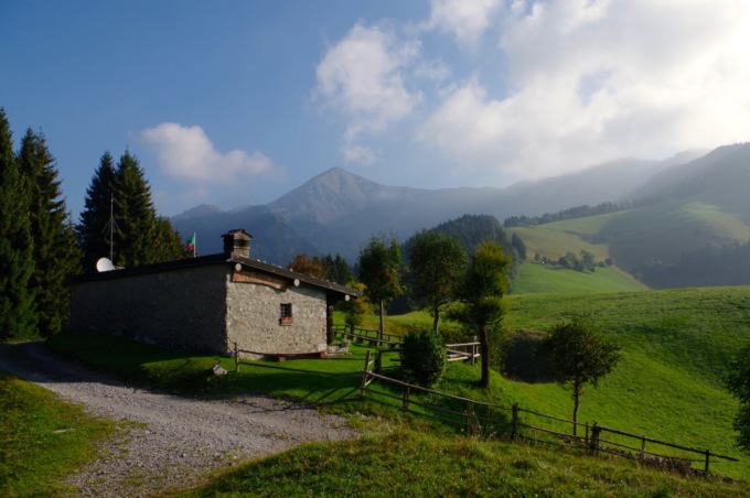 Il sentiero, sempre largo e ben visibile, continua a mezza costa costeggiando il grazioso nucleo di Grumelli (metri 1.415), offrendoci degli scorci panoramici sui vicini monti Benfit e Timogno, mentre davanti a noi spiccano il Ferrante, il Ferrantino e la Regina delle Orobie, la Presolana…