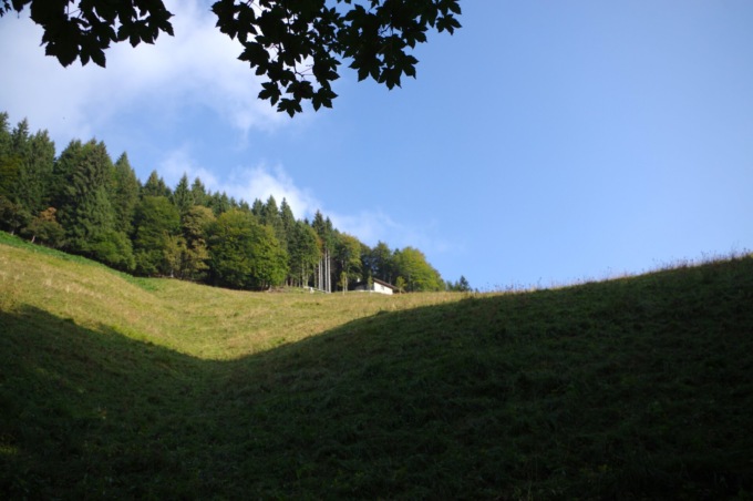 Ignorando le deviazioni, seguiamo il sentiero principale, che, sempre ben segnalato e alternandosi tra tornanti e salite, risale nel bosco tra frassini, abeti e noccioli. Il percorso è reso ancora più suggestivo dalle piccole baite presenti lungo la via, tutte collocate in luoghi panoramici e assolati, con bella vista sulla vallata circostante.
