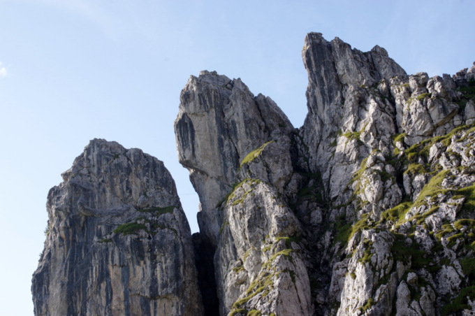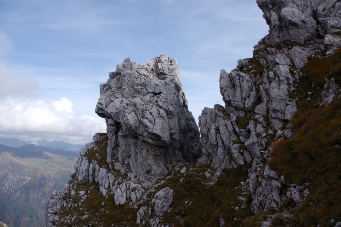 Il tracciato sale ripido nel bosco, portandoci dopo circa 45 minuti di cammino in prossimità di una ripida parete di roccia, dove negli ultimi anni sono state aperte numerose vie di arrampicata. Il sentiero prosegue a mezza costa tra sfasciumi e ghiaioni, costeggiando il Torrione Brassamorti, piramide rocciosa spesso meta di arrampicatori. Con un’ultima ripida salita pieghiamo a destra, puntando all’evidente Passo della Forca (m. 1.848), dove ad attenderci troviamo la Baita del Gioan. Questo bivacco, ricavato sotto una grande roccia, serve da riparo agli escursionisti in caso di maltempo.