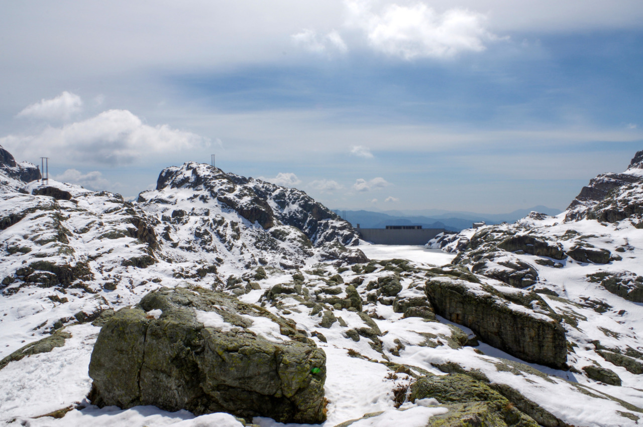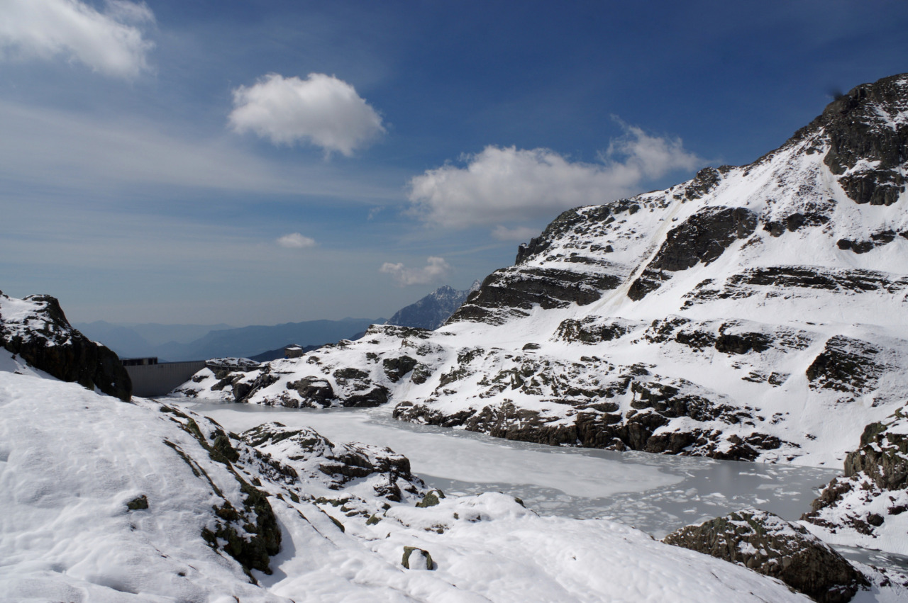 Scattate le foto di rito continuiamo, fino a toccare la diga del lago d’Aviasco (m. 2.061); le sue acque si estendono per più di 70 mila metri quadrati e qui si trova il bacino più vecchio dell’intero comprensorio. Questa volta il panorama è caratterizzato dalla mole del Pizzo Pradella, bianca piramide di oltre 2.700 metri.