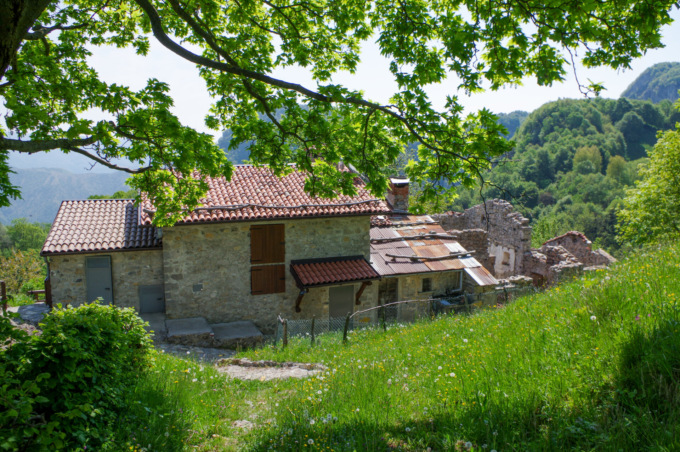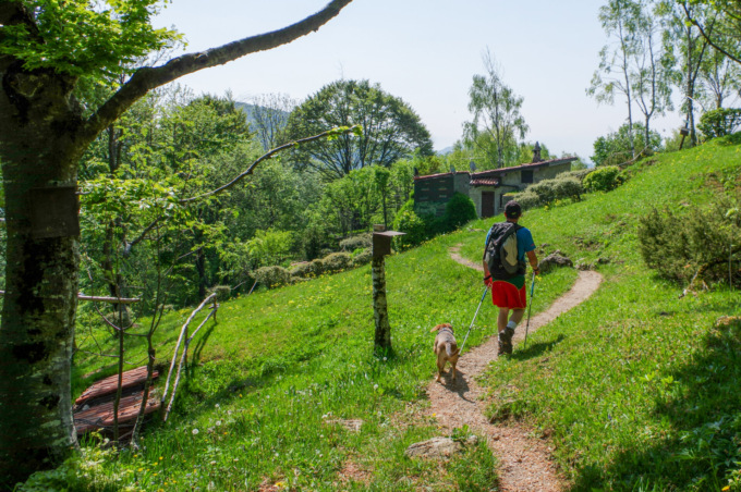 Continuiamo in falsopiano per alcuni minuti e attraversiamo una conca prativa, fino a raggiungere una bellissima abitazione in pietra. Il sentiero piega a sinistra e riprende a salire, sempre ben segnalato, fino a portarci in prossimità di un bivio, che riporta le indicazioni per il borgo di Sussia e il Pizzo Cerro.