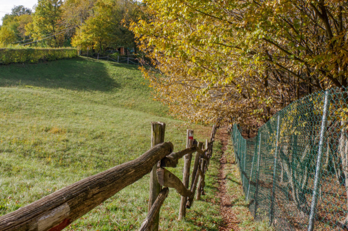 Lasciato l’anfratto alle nostre spalle, continuiamo lungo il sentiero. Seguendo le indicazioni risaliamo il prato, costeggiando la recinzione metallica che delimita l’entrata superiore della caverna. Si continua attraverso un bosco ricchissimo di castagni, fino a raggiungere la località Sommi, che regala uno splendido panorama sulle cascine circostanti…