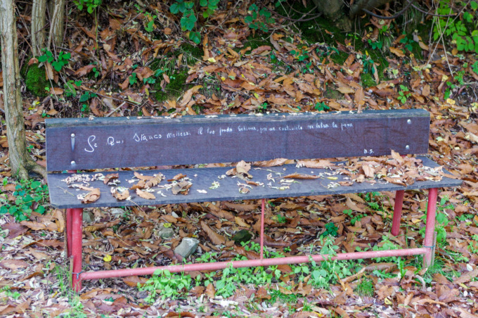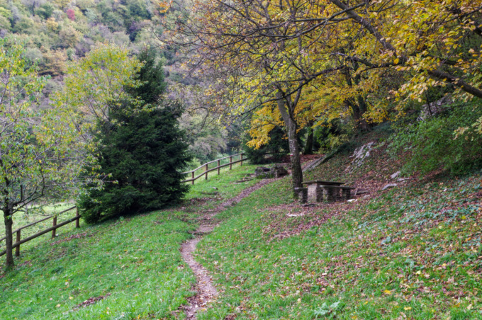 Dopo la visita proseguiamo, imboccando la ripida via Luèt. Si risale la strada cementata per imboccare il sentiero posto a destra, proseguendo in falsopiano attraverso i colori del bosco. Dopo aver superato una piccola fonte, raggiungiamo l’ampio pianoro che ospita Parco Stoppani, adagiato tra i castagni e attrezzato con tavoli e panchine.