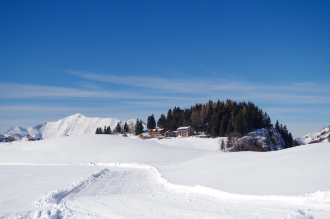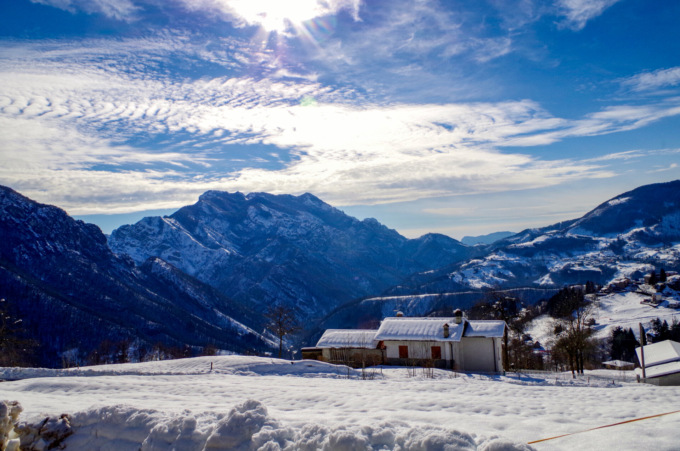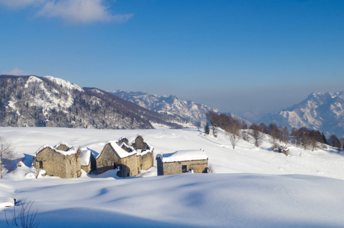 Raggiunto il caratteristico nucleo di case, possiamo lasciare l’auto nei pressi del paese: poco lontano diparte il sentiero Cai 155, tracciato che sale in direzione dei Piani di Artavaggio. Ciaspole ai piedi, ci incamminiamo in questo mondo magico, caratterizzato da boschi ricolmi di neve e bellissime baite ristrutturate, queste ultime secondo lo stile che contraddistingue le valli Imagna e Taleggio. Ancora oggi si possono distinguere i tipici tetti a piode e i famosi portoni a “T”, una peculiarità unica di queste zone.