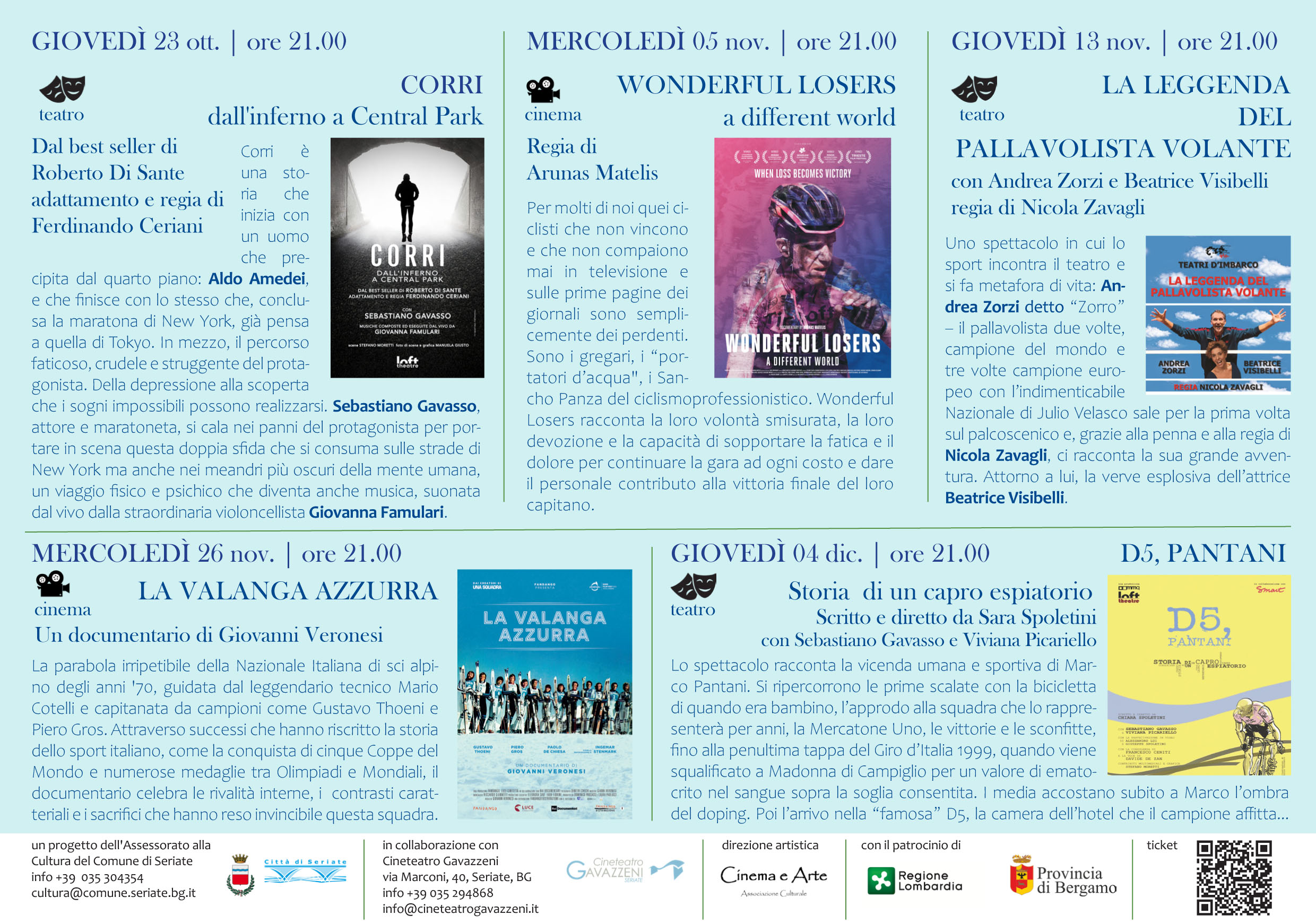 La rassegna gode del patrocinio della Regione Lombardia, della Provincia di Bergamo e del Panathlon Club Mario Mangiarotti, confermando l’importanza culturale e sociale dell’iniziativa. Tutti gli spettacoli iniziano alle ore 21 e i biglietti sono disponibili online sul sito del Cineteatro Gavazzeni. Per info e prenotazioni è possibile recasi in Via Marconi, 40 a Seriate o chiamare al 035 294868.