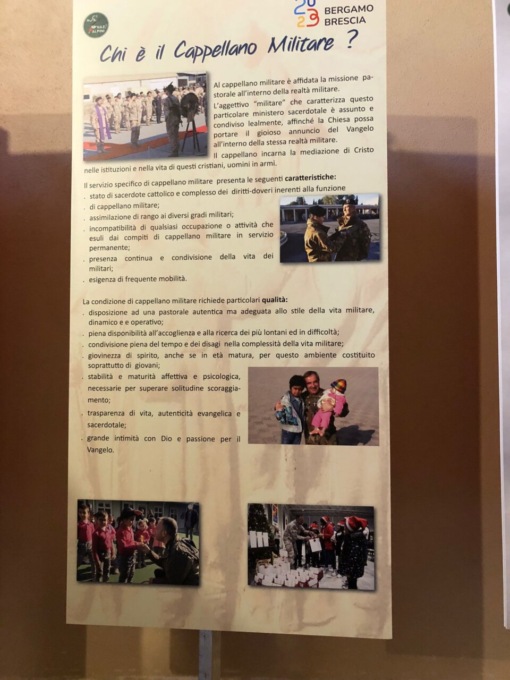 Al momento celebrativo erano presenti il presidente della sezione di Bergamo, Giorgio Sonzogni, il capogruppo della sezione di Curno, Carlo Gerevini, il capo nucleo di Protezione Civile Ana di Curno, Manuel Torri, oltre a don Dante e don Flavio, che hanno benedetto e guidato una breve preghiera prima del taglio del nastro. «Mi è sempre piaciuto lo stemma dell’ordinariato militare “Fides, Charitas, Spes”, fede speranza e carità, che racchiude tutto il programma dei cappellani militari», ha dichiarato don Dante. Don Flavio ha aggiunto che «grande motivo di compiacimento è il fatto che, a distanza di un anno dal convegno sui cappellani militari a Sarnico, sia nata questa mostra itinerante».