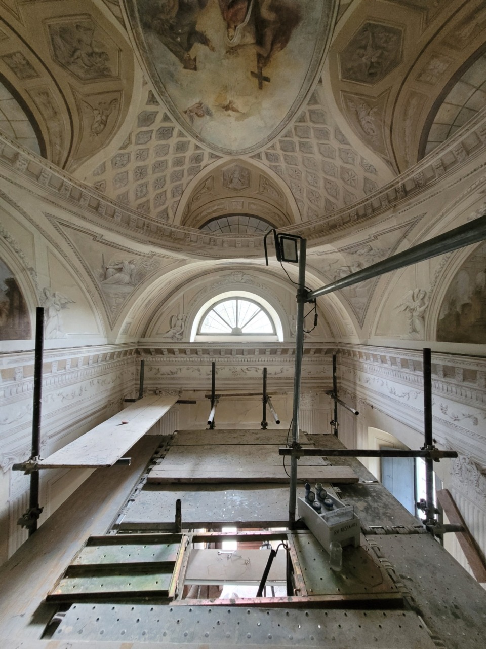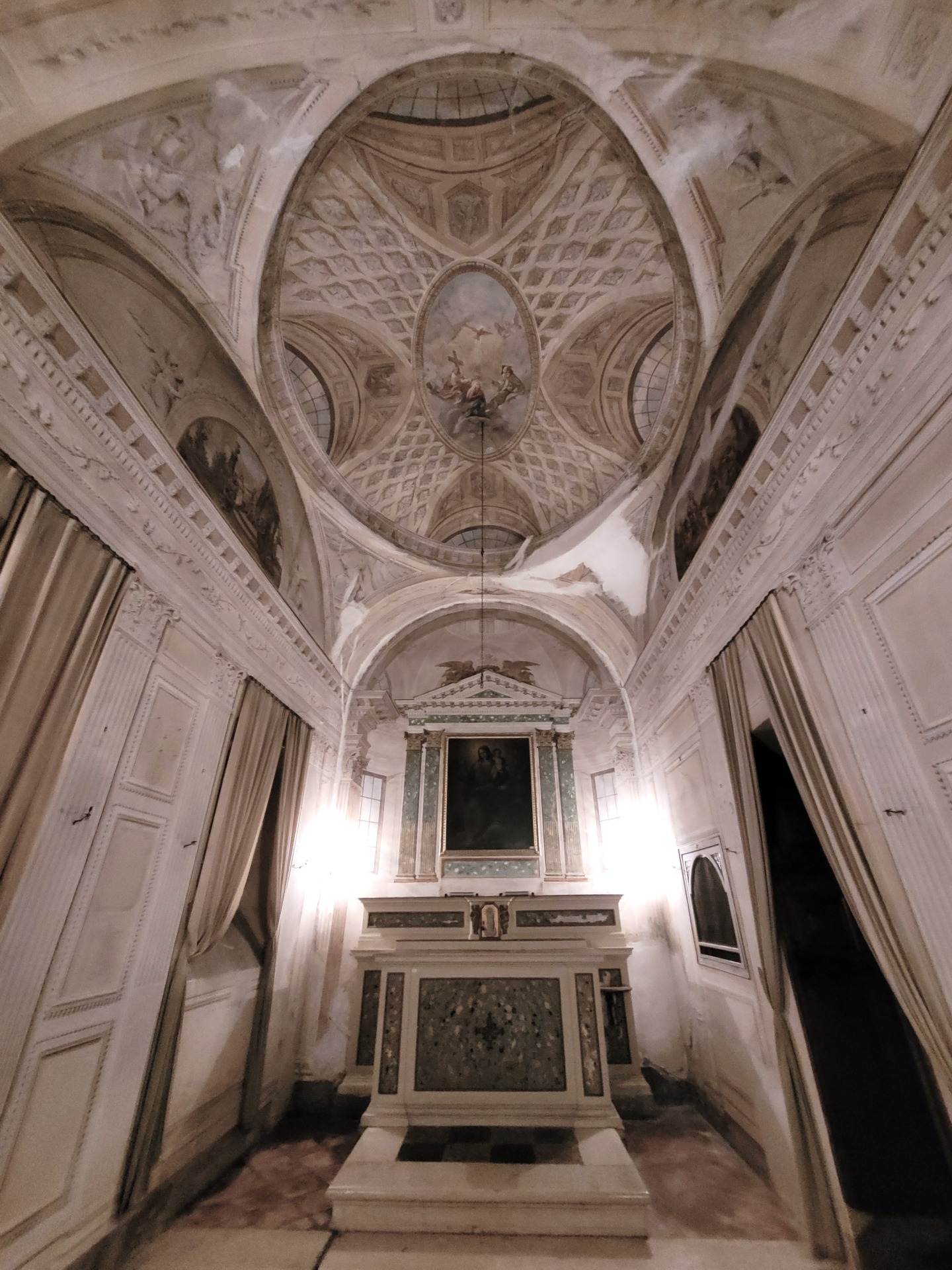 Lontana dagli occhi di tutti, la cappella era stata da tempo dimenticata, nascosta da infiltrazioni e cedimenti. Grazie a un restauro delicato durato un anno, le pareti hanno riacquistato colore e vita: affreschi settecenteschi raccontano ora il ciclo dell’Incoronazione della Vergine Maria, mentre la pala d’altare seicentesca torna a splendere nella sua cornice originale. Gli antichi oggetti liturgici e il piccolo organo settecentesco completano l’atmosfera.
