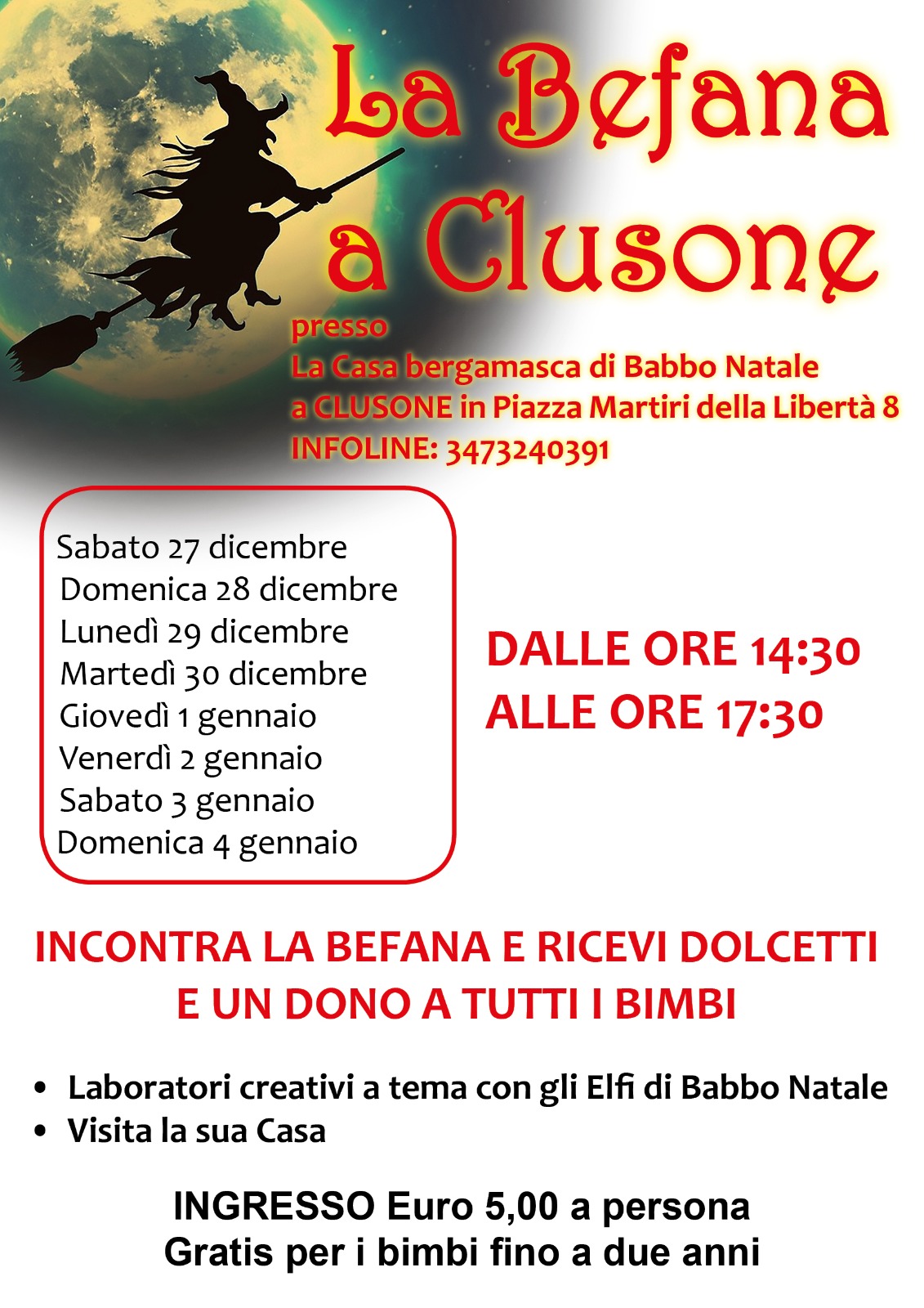Pur impegnata nel distribuire doni un poco ovunque, la Befana sarà nella “sua” Casa Bergamasca a Clusone per otto pomeriggi, da sabato 27 dicembre a domenica 4 gennaio dalle 14.30 alle 17.30 (chiuso il 31 dicembre). Ci saranno laboratori creativi con gli Elfi e la possibilità di visitare le diverse stanze. La simpatica vecchina distribuirà doni e dolcetti ai bambini (ingresso 5 euro, gratis bimbi sino a 2 anni).