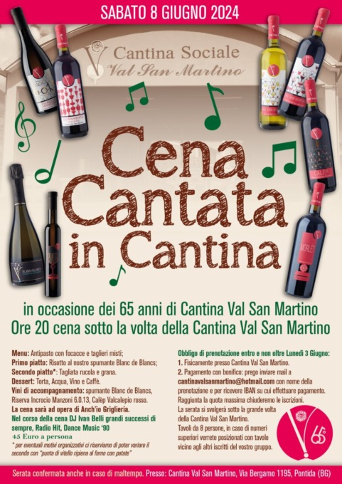 La Cantina Val San Martino di Pontida compie 65 anni e festeggia con una Cena Cantata in Cantina, che si terrà sotto la sua grande volta di via Bergamo 1195 il prossimo sabato 8 giugno alle 20. Si tratta della prima cantina sociale della Bergamasca, nata nel 1959.