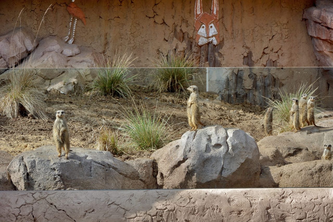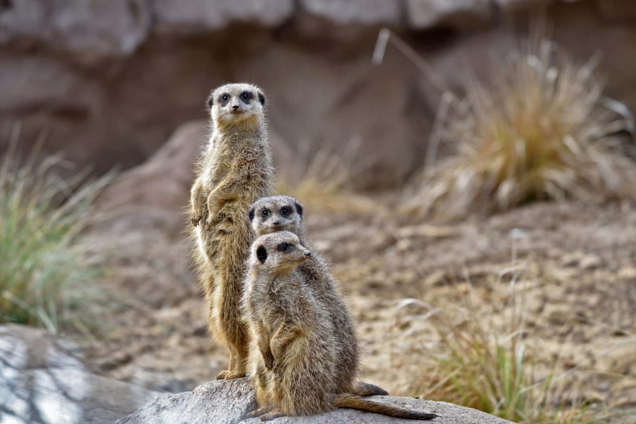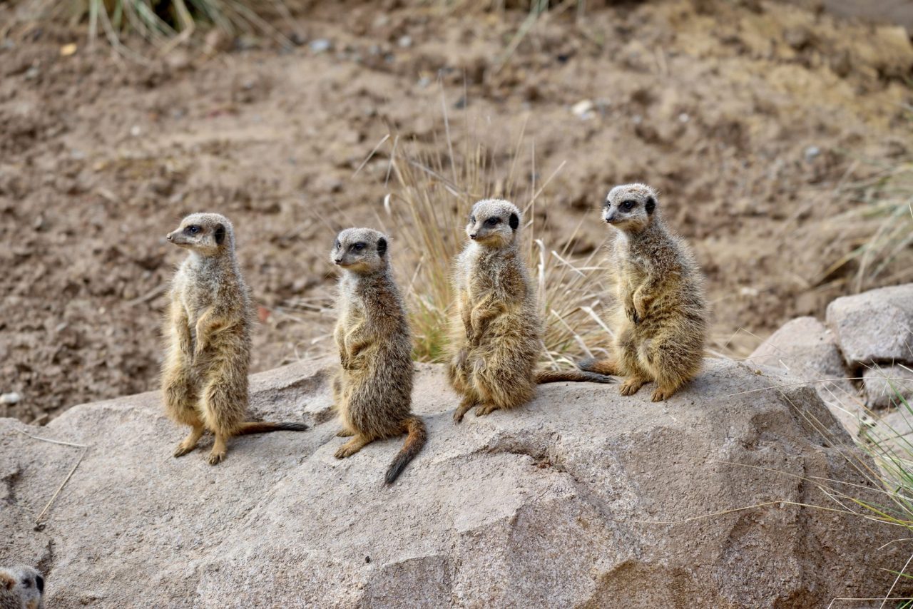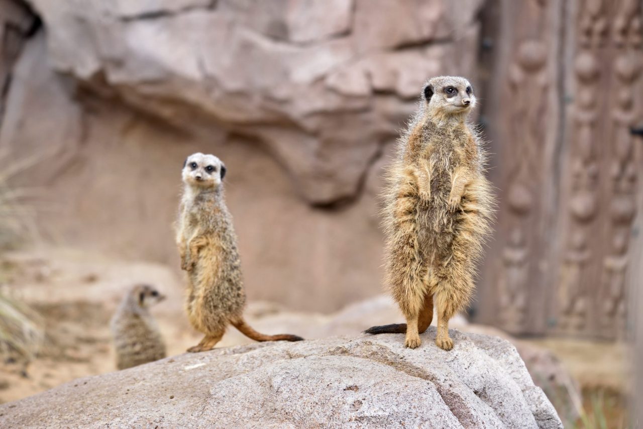 Attivi a ogni ora. I visitatori potranno osservarli durante ogni ora del giorno: sono socievoli, vivaci, incuriositi dagli uomini (basti pensare che interagiscono direttamente con i keeper che gli accudiscono) e sono sempre in movimento, specie durante il giorno. Le colonie possono arrivare fino a 30 individui. Quando non si fanno vedere è perché rientrano nelle caratteristiche tane che scavano sotto terra, collegandole tra loro da dei veri e propri tunnel. E sono anche molto attenti alla loro privacy: in genere, un membro del gruppo fa da sentinella e avverte gli altri in caso di pericolo o di incursioni indesiderate emettendo dei particolari vocalizzi. Non tutti sanno, infatti, che i Suricati hanno un vero e proprio linguaggio costituito da una ventina di vocalizzi differenti che consentono alla sentinella di turno di comunicare non solo l’eventuale comparsa di un predatore ma anche la natura (ad esempio se si tratta di un rapace che arriva dal cielo o di uno sciacallo che arriva da terra), la posizione e la velocità con cui si muove.