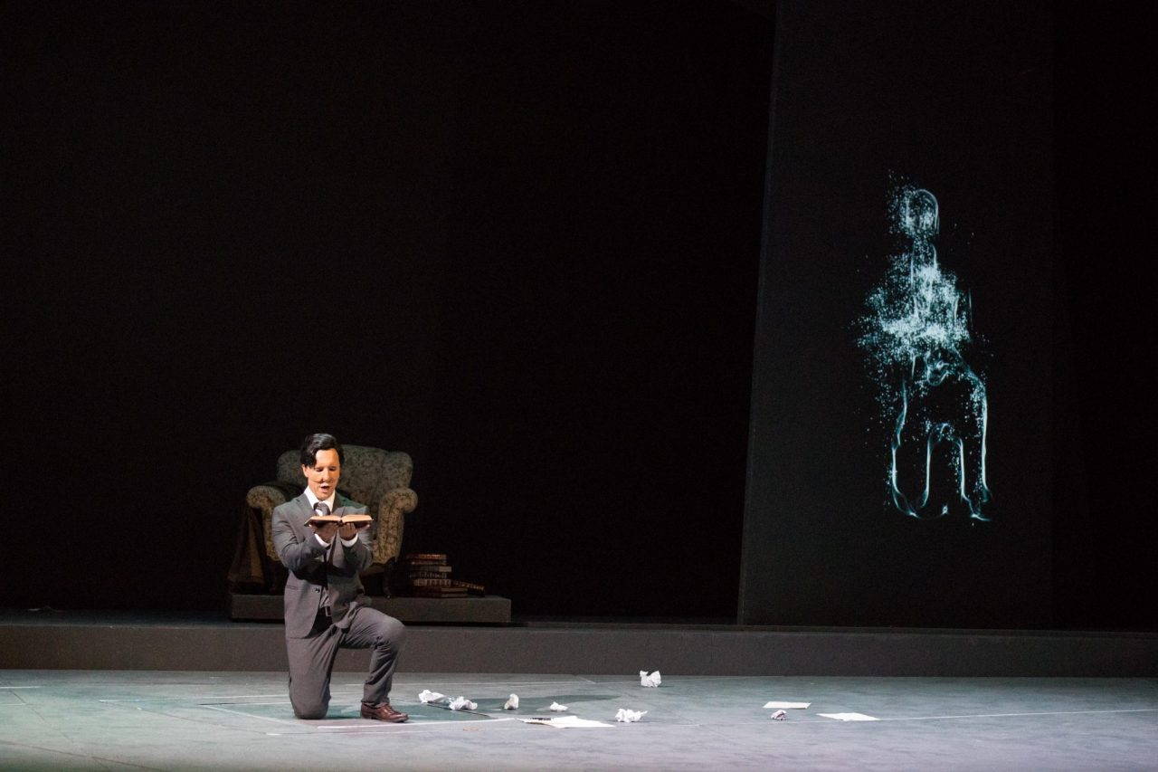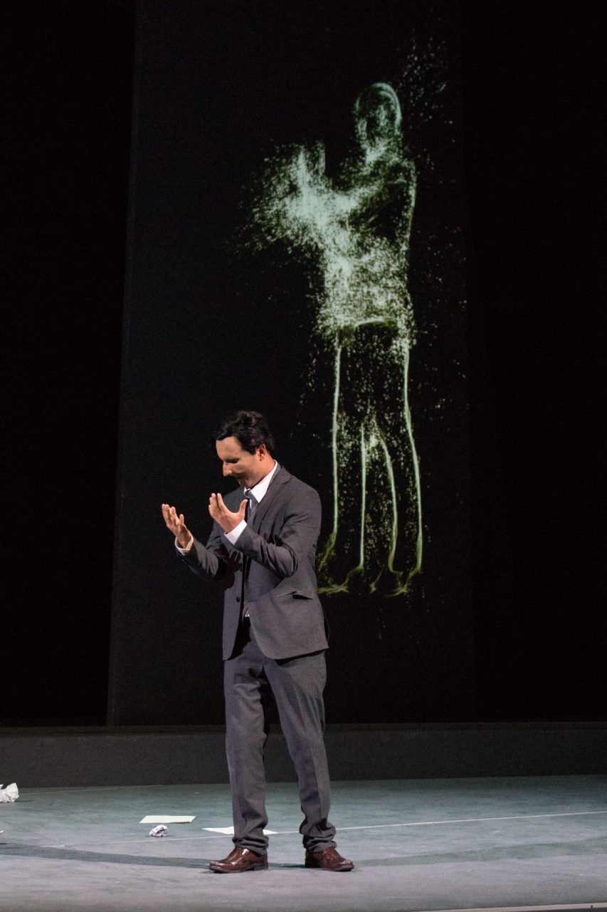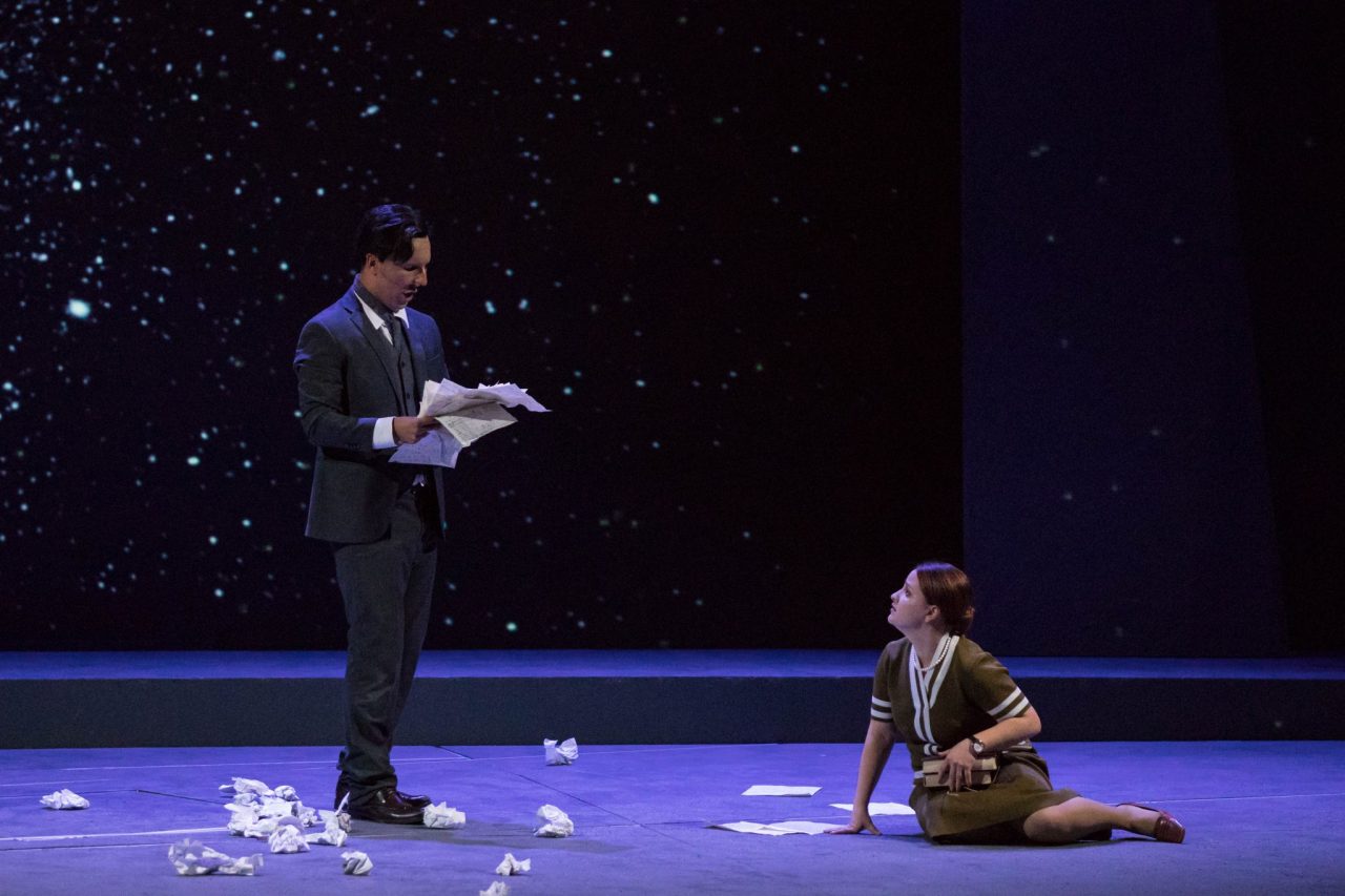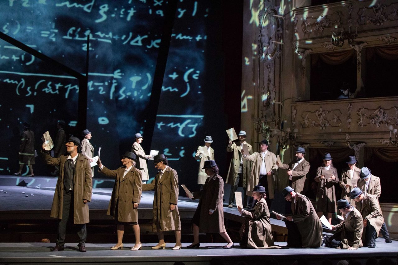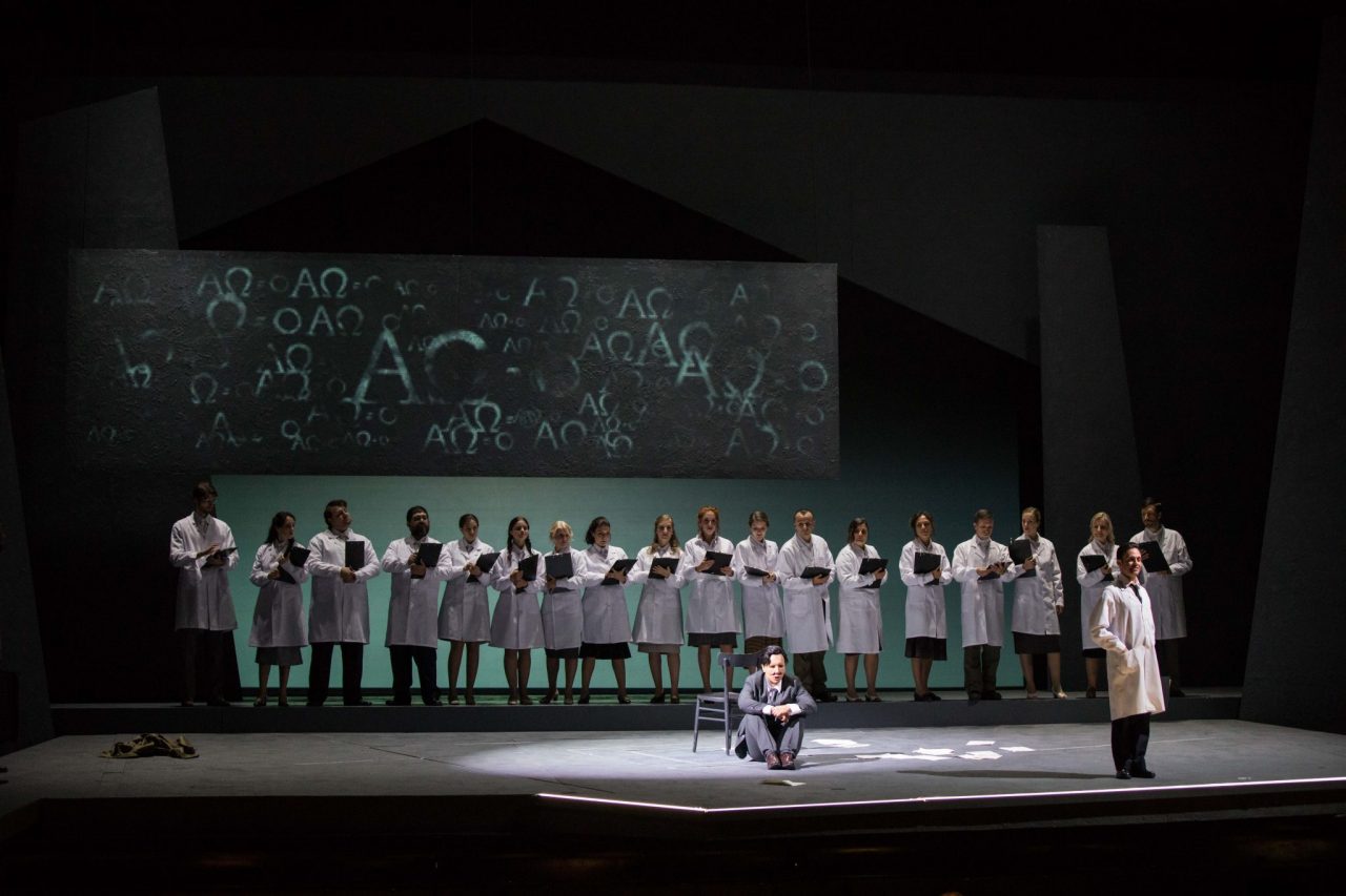 La partitura firmata da Roberto Vetrano (allievo di Ivan Fedele all’Accademia di Santa Cecilia) ha ricevuto recensioni decisamente positive, meno il libretto di Simone Pintor, anche regista, giudicato un po’ debole. Ma la bontà drammaturgica del risultato non viene messa in discussione, anzi, la qualità di orchestra e soprattutto del coro la rafforza. Sono piaciute in particolare le parti polifoniche. Semplici ma funzionali le scene del 34enne Gregorio Zurla: pannelli irregolari di colore scuro che, sul fondo, isolano una forma geometrica a cinque lati, simile a una casa sghemba, e una passerella che gira attorno alla buca d’orchestra. L’allestimento risulta coinvolgente e inclusivo del pubblico, con alcuni cantanti che scendono in platea. Gli spettatori si sentono partecipi. A questa idea concorre anche la completa riconfigurazione della sala teatrale con un videomapping a 360 gradi, a cura del team Studio Antimateria, di forte impatto estetico ed emotivo: durante i 90 minuti di musica si susseguono così immagini dinamiche di cieli stellati, mari calmi o in tempesta, vedute metropolitane, formule matematiche, pupille, gorghi di elettricità, strumenti fisici e astronomici, tappezzerie floreali.