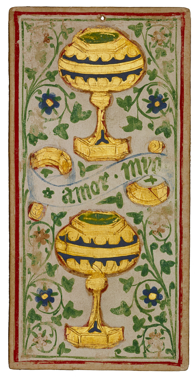 Il percorso della mostra si snoda attraverso sette sezioni. La prima è dedicata all’ambiente della corte, in cui i tarocchi sono nati, alle sue ritualità e ai giochi dei cortigiani, ed espone, tra le altre cose, una raccolta di romanzi cavallereschi, una scacchiera, un arazzo con scene di caccia e una scatola da gioco oltre che un primo embrionale mazzo di carte da gioco. La seconda parte è invece dedicata ai I trionfi di Petrarca, opera che ha influenzato moltissimo l’immaginario dell’epoca e che ha trovato in parte una trasposizione visiva nelle carte degli arcani maggiori che, in origine, venivano chiamati appunto “trionfi”.