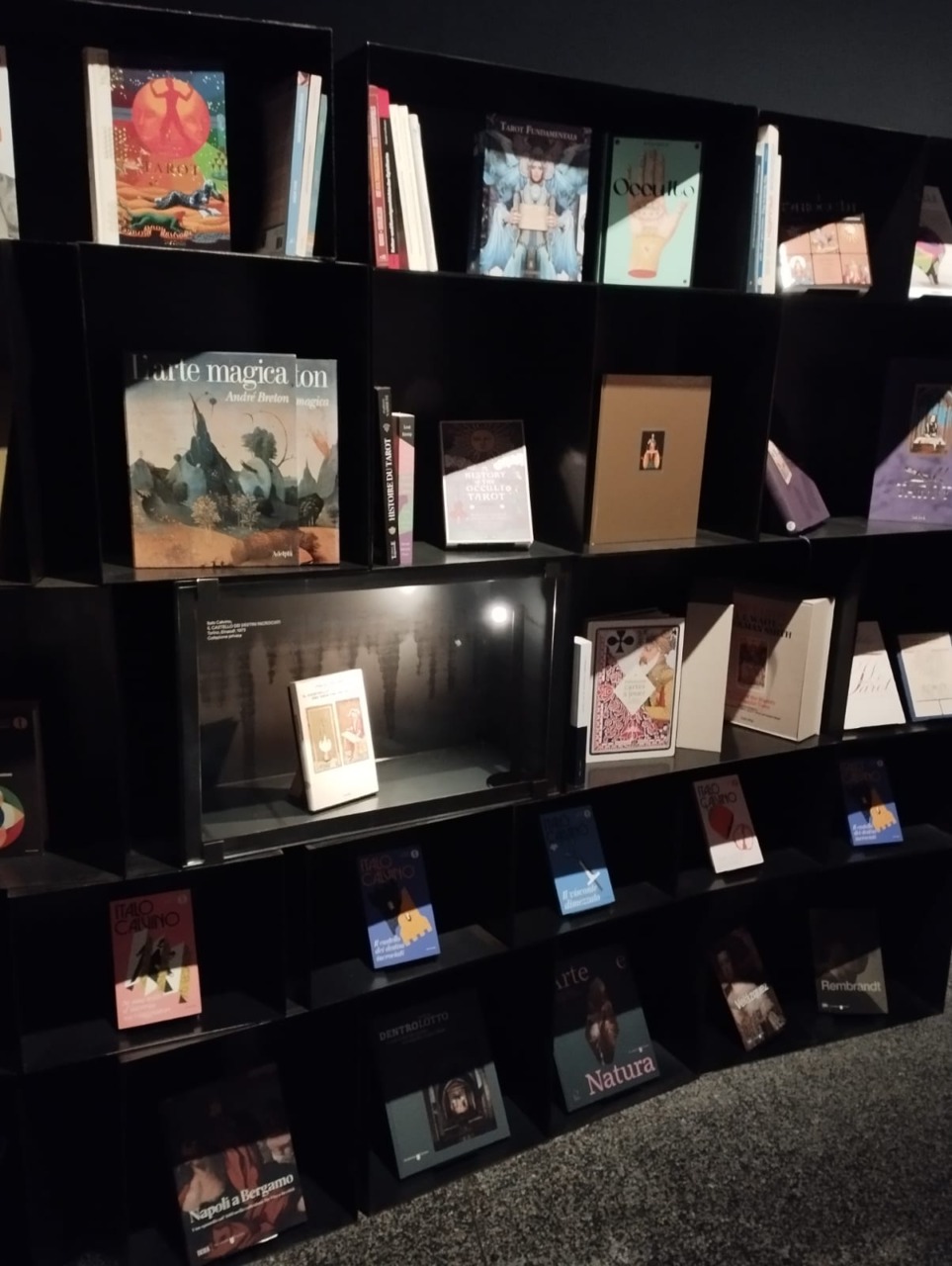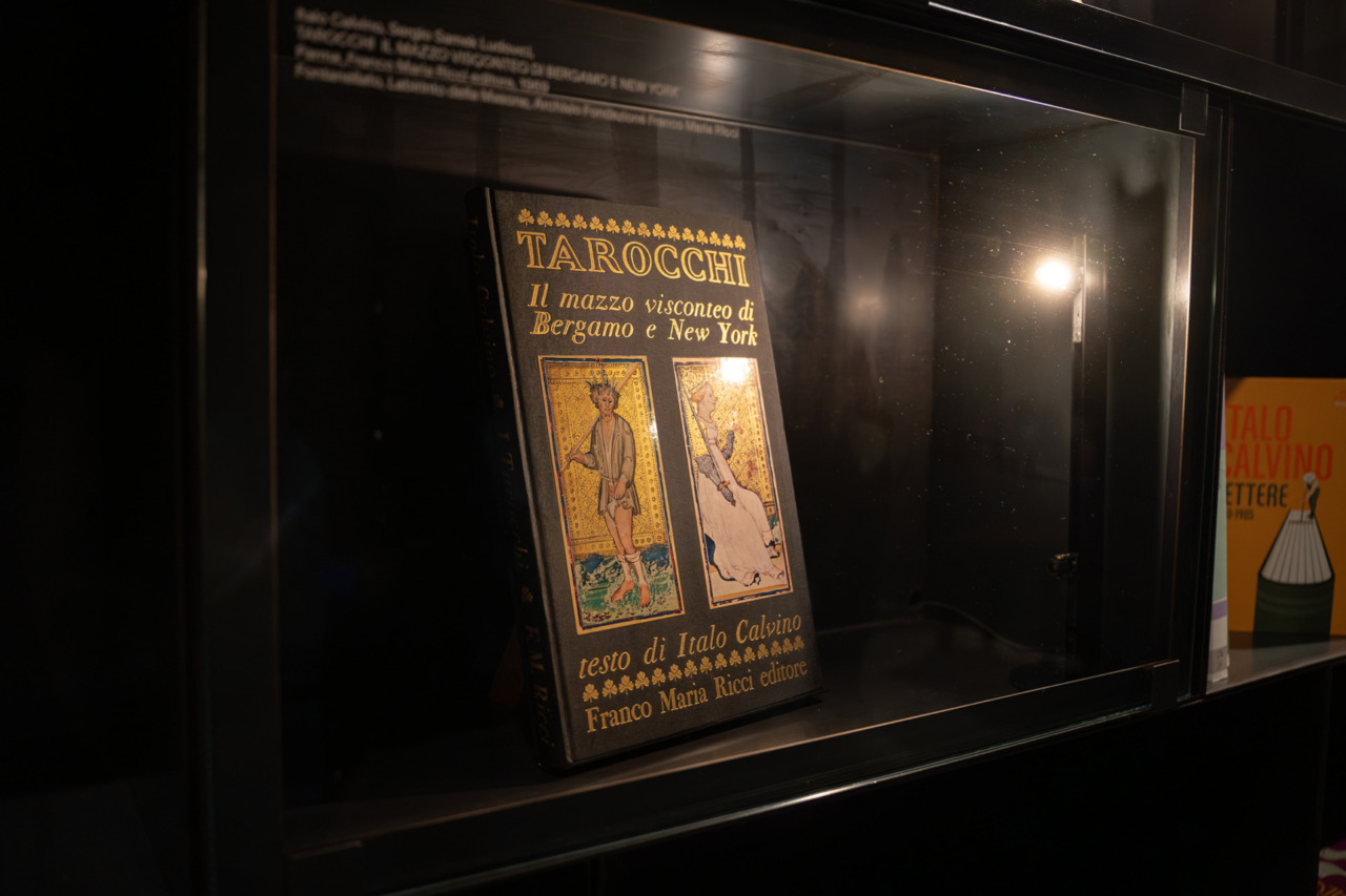 Dalla terza sezione, che espone due mazzi di tradizione viscontea, si accede a un’area dedicata a Italo Calvino. Una piccola biblioteca con poltrone dove i visitatori e le visitatrici potranno fermarsi a leggere i libri, tutti rigorosamente dedicati ai tarocchi, disponibili sugli scaffali. Tra le numerose copie de Il castello dei destini incrociati, anche manuali di lettura di tarocchi, come il celebre La via dei tarocchi di Alejandro Jodorowsky, volumi illustrati e testi artistici.