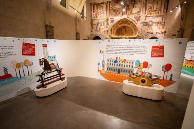 La narrazione è stata affidata a Laura Salvi, illustratrice e autrice di libri dedicati all’infanzia, che ha saputo coniugare le storie dei giocattoli con quelle della città, in un racconto dove oggetti antichi accompagnano i visitatori alla scoperta della città di oggi: da Piazza Vecchia alla Valle della Biodiversità, dal Bosco della Memoria al Sentierone. Cuore della mostra una grande giostra, progettata in forme contemporanee dall’architetto Roberta Radaelli, che ha curato il progetto di allestimento complessivo, su cui sono presenti tre monumentali cavalli, tra cui Valdo, scolpito in legno dallo scultore Frederich Hein nel 1870. Dal suo laboratorio uscivano i migliori cavalli intagliati di tutta la Germania ed erano stati nominati “i cavalli da parata di Dresda”.