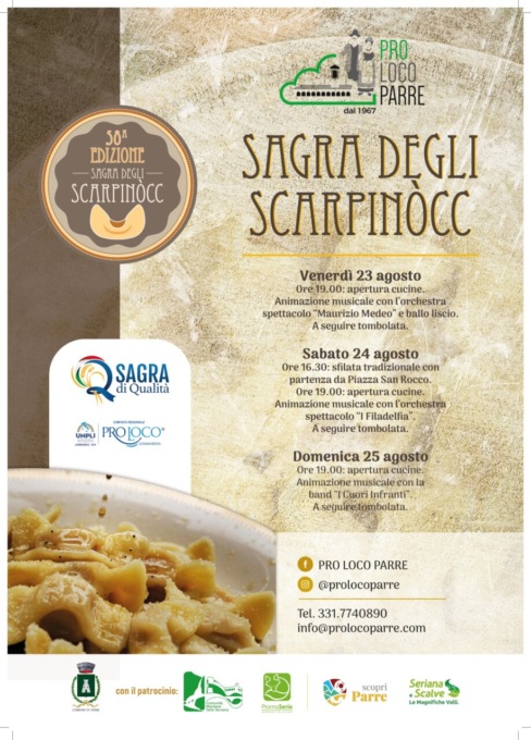 Torna a Parre, per la sua cinquantottesima edizione, la sagra degli scarpinòcc: la tradizionale manifestazione che ogni anno richiama migliaia di amanti della buona forchetta, quest’anno si terrà da venerdì 23 a domenica 25 agosto.
