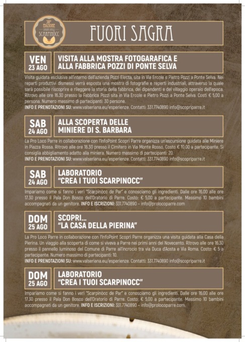 Il programma di iniziative collaterali prevede per venerdì, alle 16.30, la visita guidata alla mostra fotografica Pozzi-Electa alla fabbrica Pozzi di Ponte Selva; sabato e domenica, dalle 16 alle 17, il laboratorio per bambini “Crea i tuoi scarpinòcc” con la ricetta originale; sabato visita alla Galleria di Santa Barbara; domenica “Scopri… la Casa della Pierina”, visita guidata alla Parre dei primi del Novecento.