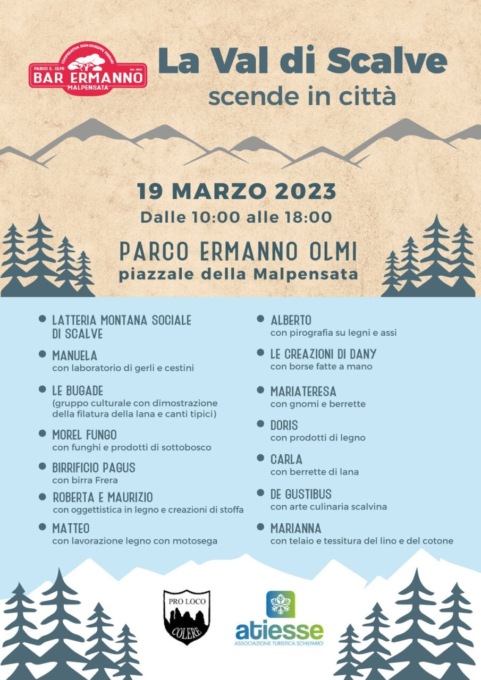 Domenica 19 marzo, dalle 10 alle 18, il Parco Olmi nel quartiere Malpensata di Bergamo sarà punto di incontro per i prodotti tipici della Valle di Scalve, grazie all’iniziativa che unisce la Cooperativa don Giuseppe Ferrari, la Pro Loco Colere e l’Atiesse – Associazione Turistica Schilpario.