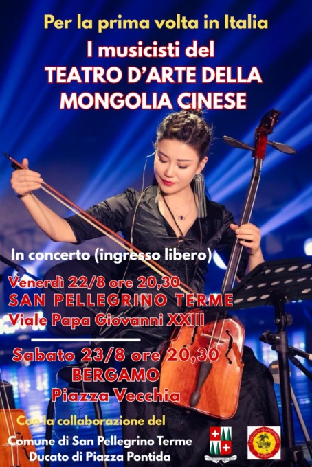 Grazie alla collaborazione del Comune di San Pellegrino Terme e del Ducato di Piazza Pontida gli orchestrali del Teatro di Hohhot, la capitale dell’Inner Mongolia, mostreranno ai bergamaschi e ai tanti turisti che affollano la Valle Brembana e Città Alta, i loro tipici violini a testa di cavallo e le straordinarie interpretazioni vocali del khoomei, il canto gutturale mongolo, con suoni che lasceranno di stucco.
