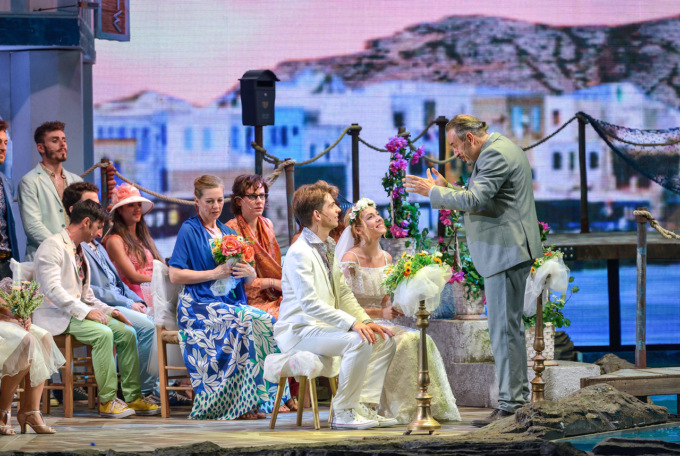 Il musical, prima versione interamente originale realizzata da Massimo Romeo Piparo con una produzione tutta italiana, premiata con il Premio Internazionale Flaiano nel 2018, offre al pubblico una messa in scena spettacolare e tecnologica: grazie a un pontile sospeso, barche ormeggiate, un vero bagnasciuga, pedane girevoli, una locanda dai caratteristici colori nelle sfumature del bianco e del blu con cascate di bouganvillea, si ha davvero l’impressione di godere della bellezza di una incantevole isoletta greca.